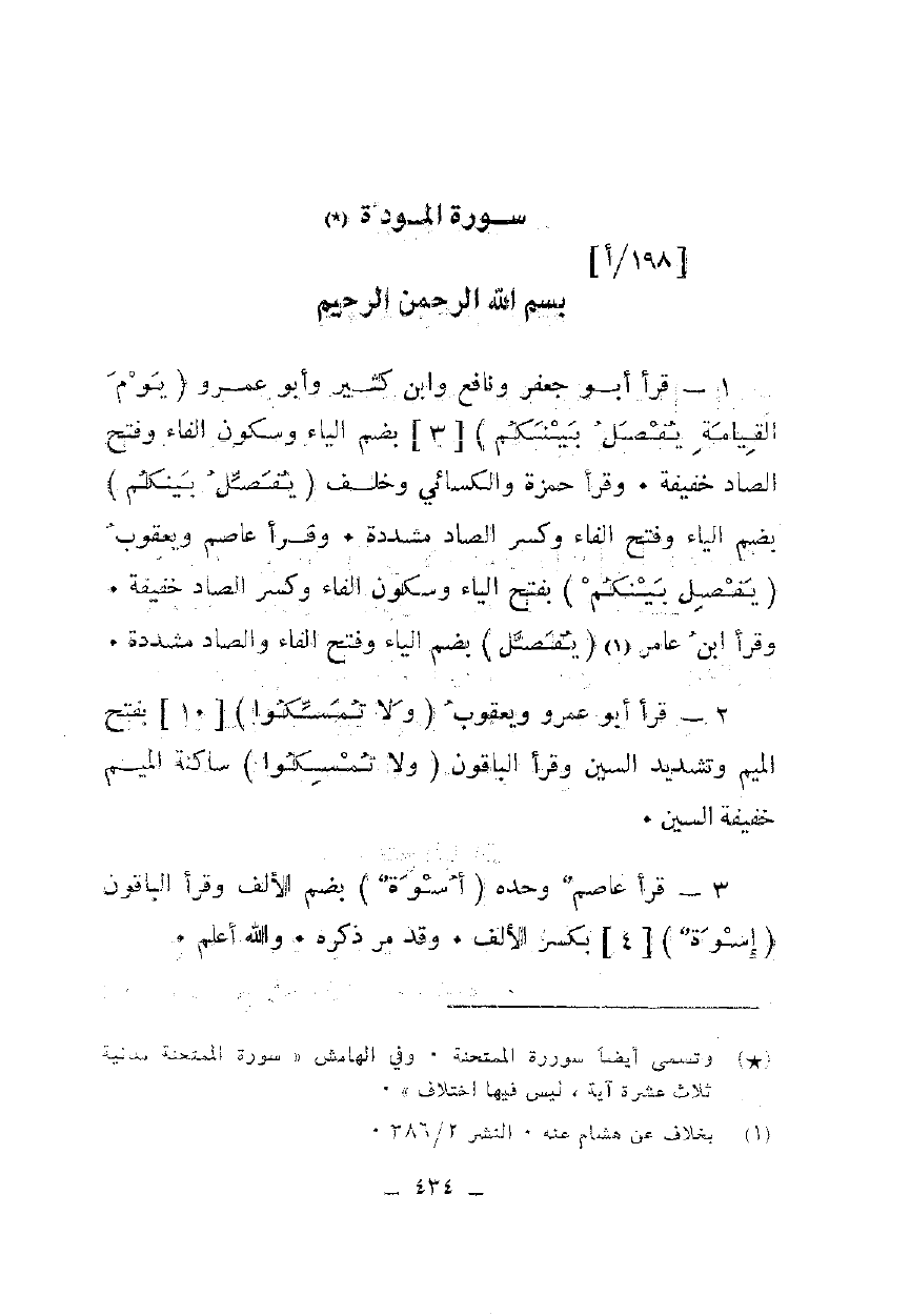 1 - قرأ أبو جعفر ونافع وابن كثير وأبو عمرو {يَوْمَ الْقِيَامَةِ يَفْصِلُ بَيْنَكُمْ} [3] بضم الياء وسكون الفاء وفتح الصاد خفيفة. وقرأ حمزة والكسائي وخلف {يَفْصِلُ بَيْنَكُمْ} بضم الياء وفتح الفاء وكسر الصاد مشددة. وقرأ عاصم ويعقوب {يَفْصِلُ بَيْنَكُمْ} بفتح الياء وسكون الفاء وكسر الصاد خفيفة. وقرأ ابن عامر {يَفْصِلُ} بضم الياء وفتح الفاء والصاد مشددة.