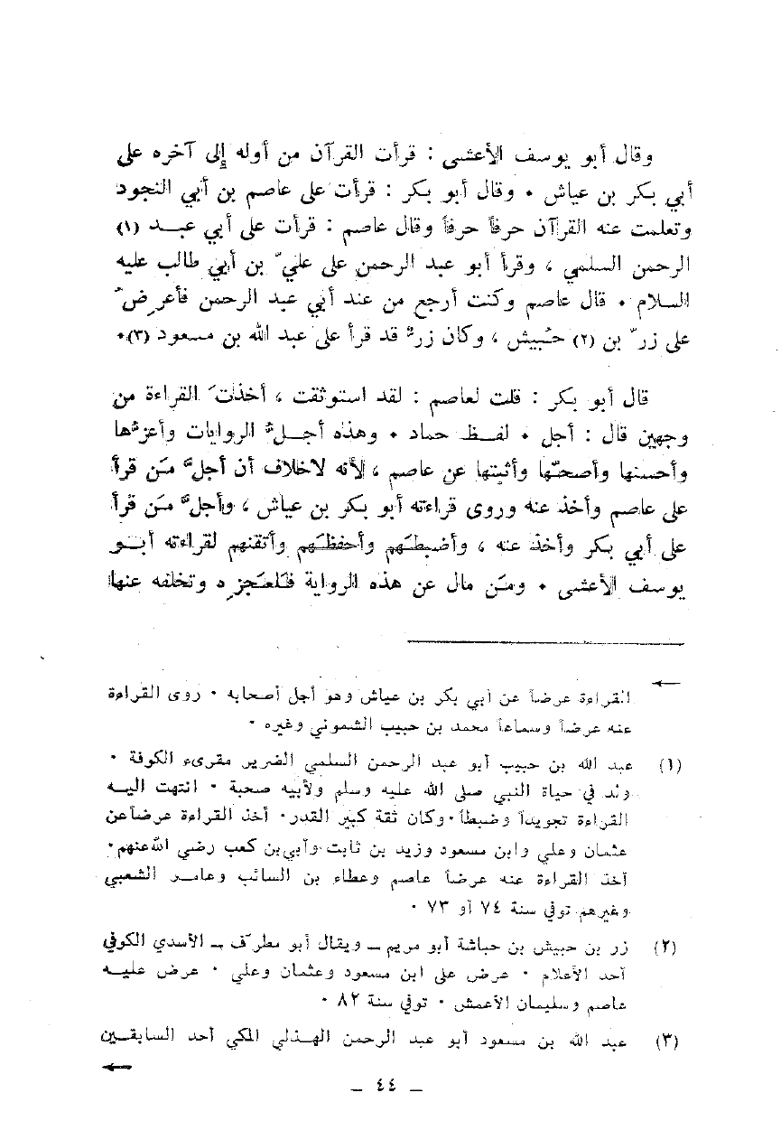 وقال أبو يوسف الأعشى: قرأت القرآن من أوله إلى آخره على أبي بكر بن عياش. وقال أبو بكر: قرأت على عاصم بن أبي النجود وتعلمت عنه القرآن حرفا حرفا وقال عاصم: قرأت على أبي عبد الرحمن السلمي، وقرأ أبو عبد الرحمن على علي بن أبي طالب عليه السلام. قال عاصم وكنت أرجع من عند أبي عبد الرحمن فأعرض على زر بن حبيش، وكان زر قد قرأ على عبد الله بن مسعود.