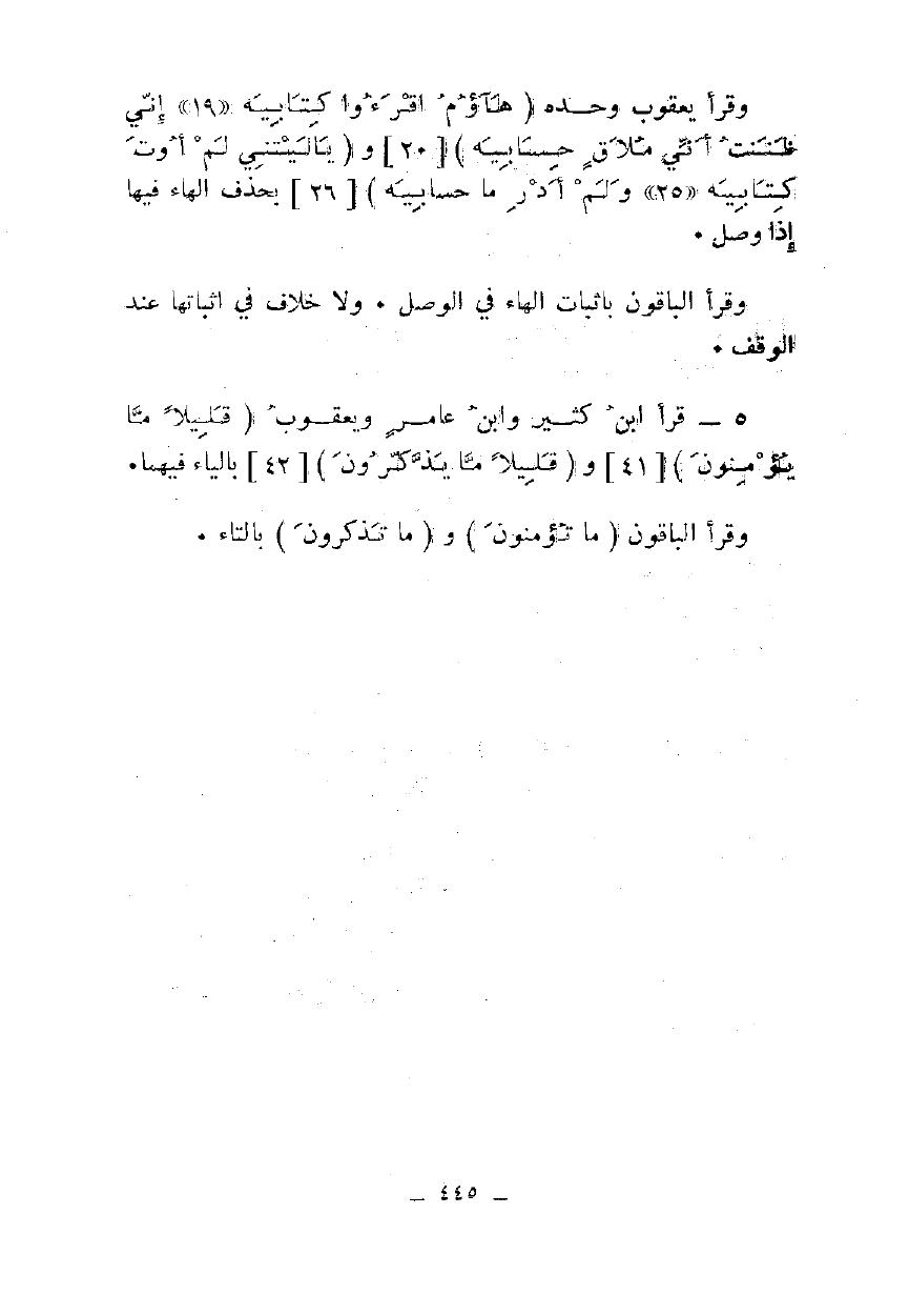وقرأ يعقوب وحده {هَاؤُمُ اقْرَءُوا كِتَابِيَهْ (19) إِنِّي ظَنَنْتُ أَنِّي مُلَاقٍ حِسَابِيَهْ} [20] و {يَا لَيْتَنِي لَمْ أُوتَ كِتَابِيَهْ (25) وَلَمْ أَدْرِ مَا حِسَابِيَهْ} [26] بحذف الهاء فيها إذا وصل.