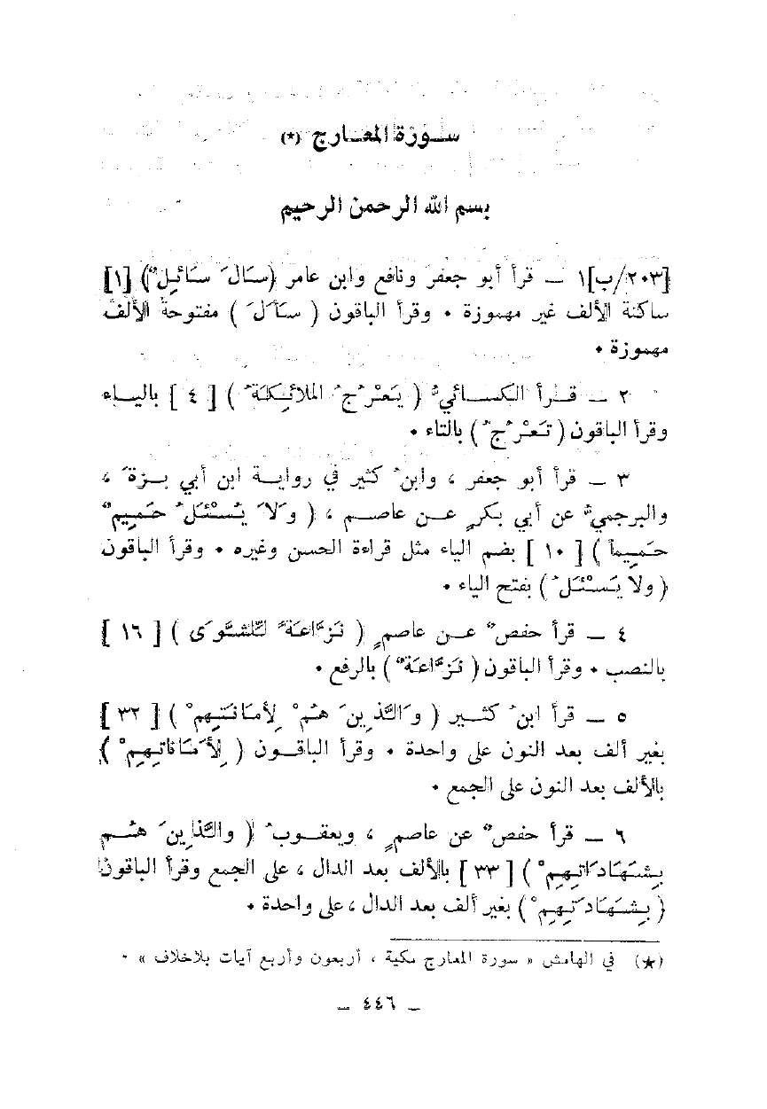 1 - قرأ جعفر ونافع وابن عامر {سَأَلَ سَائِلٌ} [1] ساكنة الألف غير مهموزة. وقرأ الباقون {سَأَلَ} مفتوحة الألف مهموزة.
