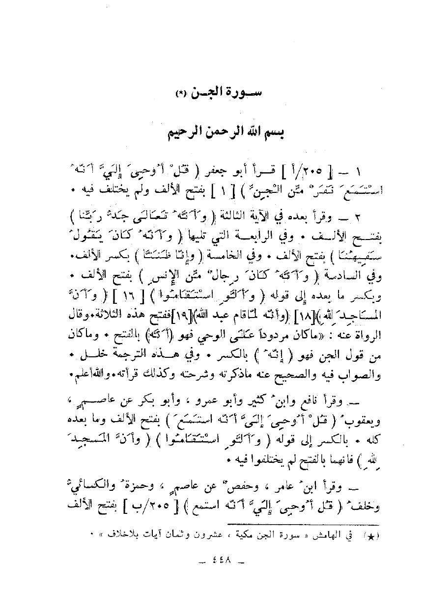 2 - وقرأ بعده في الآية الثالثة {وَأَنَّهُ تَعَالَى جَدُّ رَبِّنَا} بفتح الألف. وفي الرابعة التي تليها {وَأَنَّهُ كَانَ يَقُولُ سَفِيهُنَا} بفتح الألف. وفي الخامسة {وَأَنَّا ظَنَنَّا} بكسر الألف. وفي السادسة {وَأَنَّهُ كَانَ رِجَالٌ مِنَ الْإِنْسِ} بفتح الألف. وبكسر ما بعده إلى قوله {وَأَلَّوِ اسْتَقَامُوا} [16] {وَأَنَّ الْمَسَاجِدَ لِلَّهِ} [18] {وَأَنَّهُ لَمَّا قَامَ عَبْدُ اللَّهِ} [19] ففتح هذه الثلاثة. وقال الرواة عنه: "ما كان مردودا على الوحي فهو {أَنَّهُ} بالفتح. وما كان من قول الجن فهو {أَنَّهُ} بالكسر. وفي هذه الترجمة خلل. والصواب فيه والصحيح عنه ما ذكرته وشرحته وكذلك قرأته. والله أعلم.