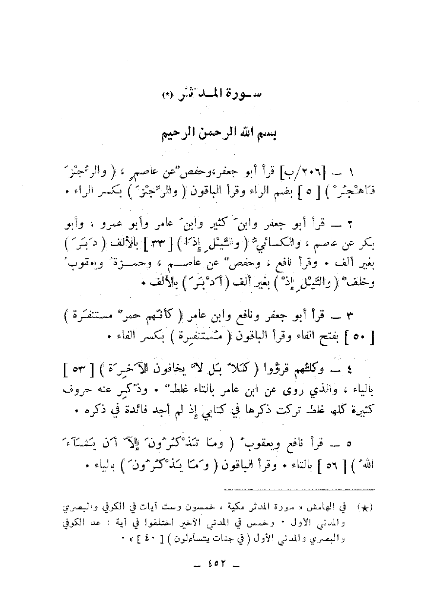 4 - وكلهم قرؤوا {كَلَّا بَلْ لَا يَخَافُونَ الْآخِرَةَ} [53] بالياء، والذي روى عن ابن عامر بالتاء غلط. وذكر عنه حروف كثيرة كلها غلط تركت ذكرها في كتابي إذ لم أجد فائدة في ذكره.