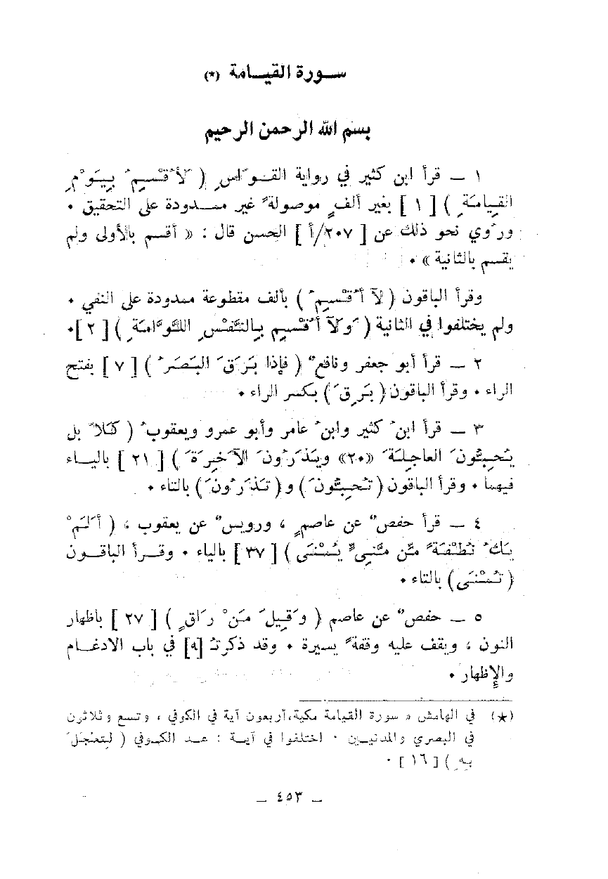 1 - قرأ ابن كثير في رواية القواس {لَا أُقْسِمُ بِيَوْمِ الْقِيَامَةِ} [1] بغير ألف موصولة غير ممدودة على التحقيق. وروي نحو ذلك عن الحسن قال: "أقسم بالأولى ولم يقسم بالثانية".
