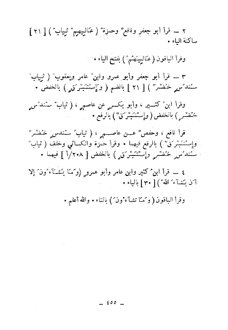 3 - قرأ أبو جعفر وأبو عمرو وابن عامر ويعقوب {ثِيَابُ سُنْدُسٍ خُضْرٌ} [21] بالضم {وَإِسْتَبْرَقٌ} بالخفض.