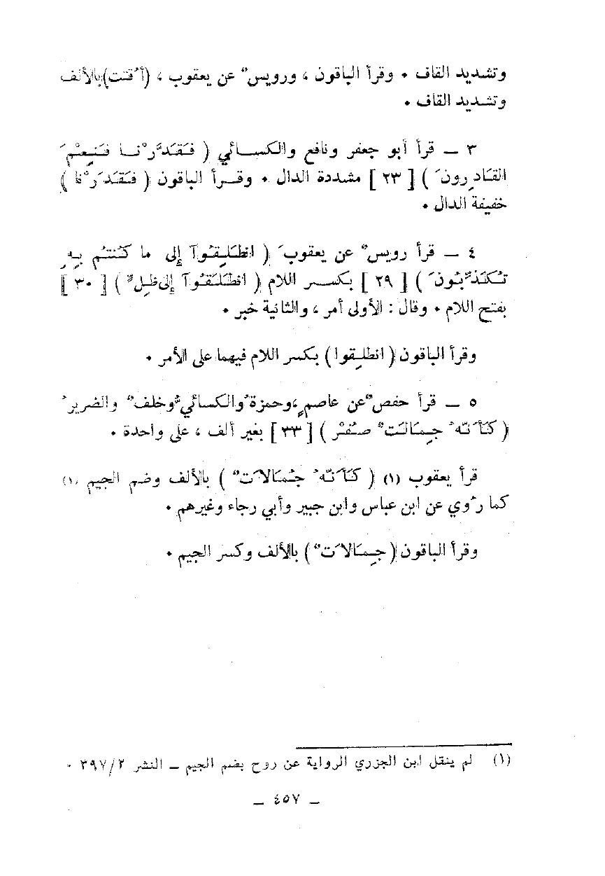 5 - قرأ حفص عن عاصم، وحمزة والكسائي وخلف والضرير {كَأَنَّهُ جِمَالَتٌ صُفْرٌ} [33] بغير ألف، على واحدة.
