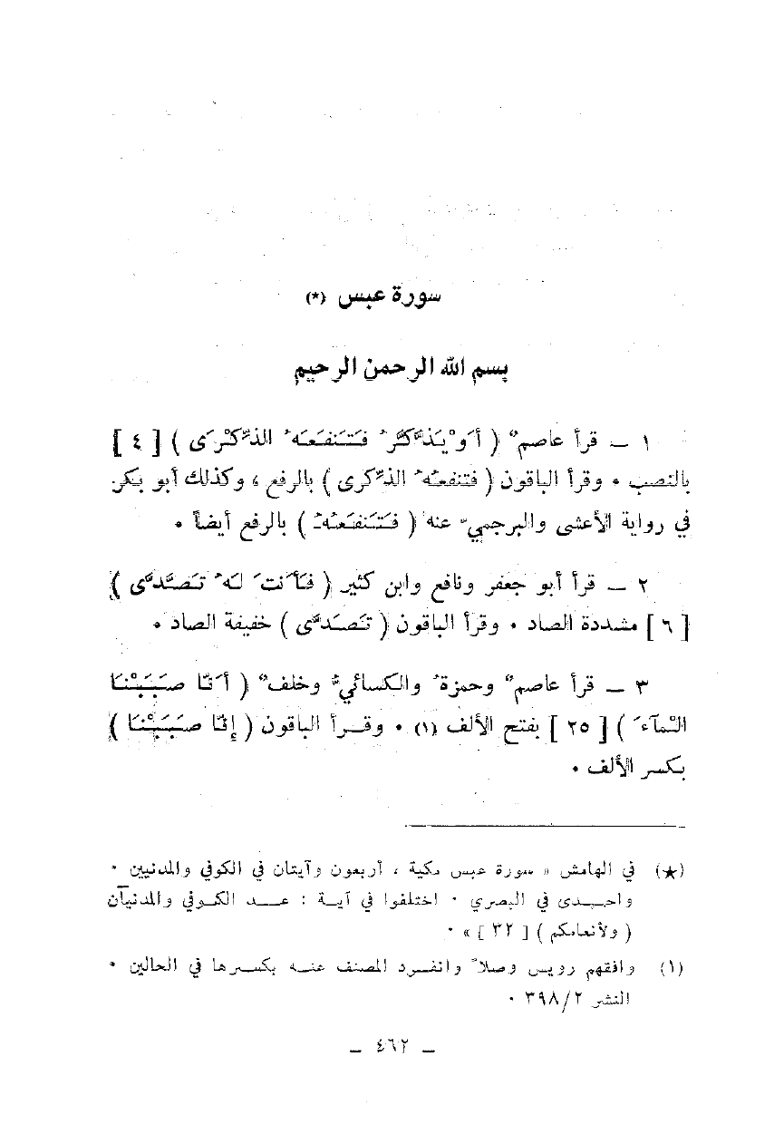 3 - قرأ عاصم وحمزة والكسائي وخلف {أَنَّا صَبَبْنَا الْمَاءَ} [25] بفتح الألف. وقرأ الباقون {أَنَّا صَبَبْنَا} بكسر الألف.