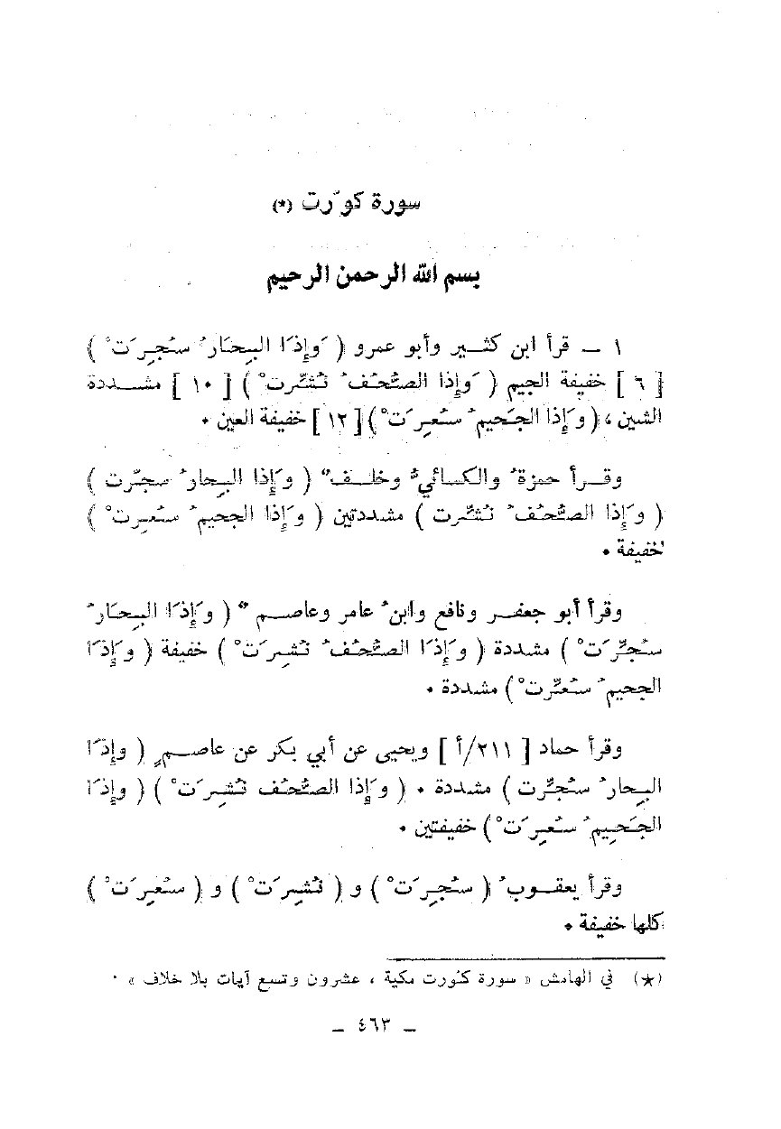 1 - قرأ ابن كثير وأبو عمرو {وَإِذَا الْبِحَارُ سُجِّرَتْ} [6] خفيفة الجيم {وَإِذَا الصُّحُفُ نُشِرَتْ} [10] مشددة الشين، {وَإِذَا الْجَحِيمُ سُعِّرَتْ} [12] خفيفة العين.