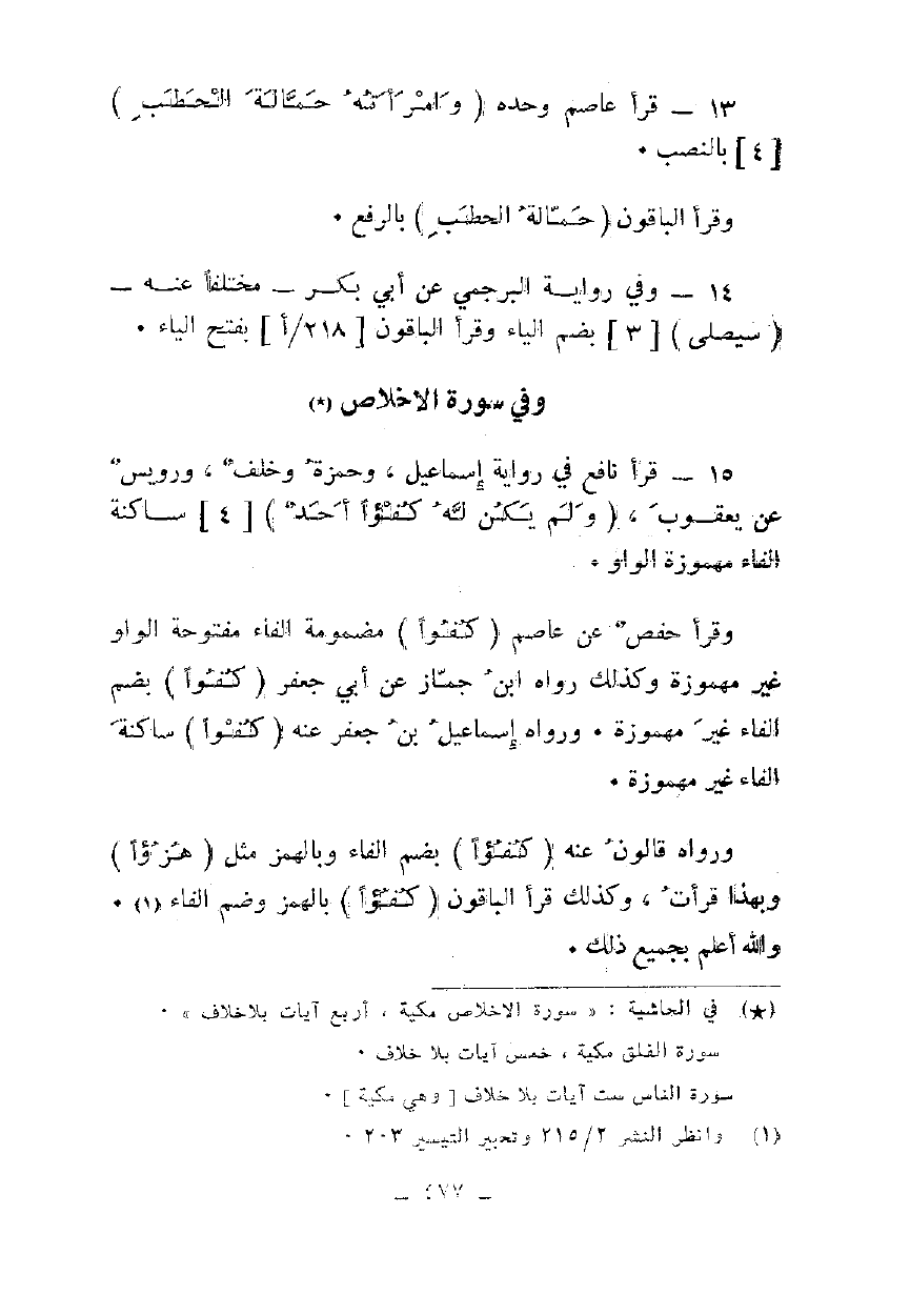 15 - قرأ نافع في رواية إسماعيل، وحمزة وخلف، ورويس عن يعقوب، {وَلَمْ يَكُنْ لَهُ كُفُوًا أَحَدٌ} [4] ساكنة الفاء مهموزة الواو.