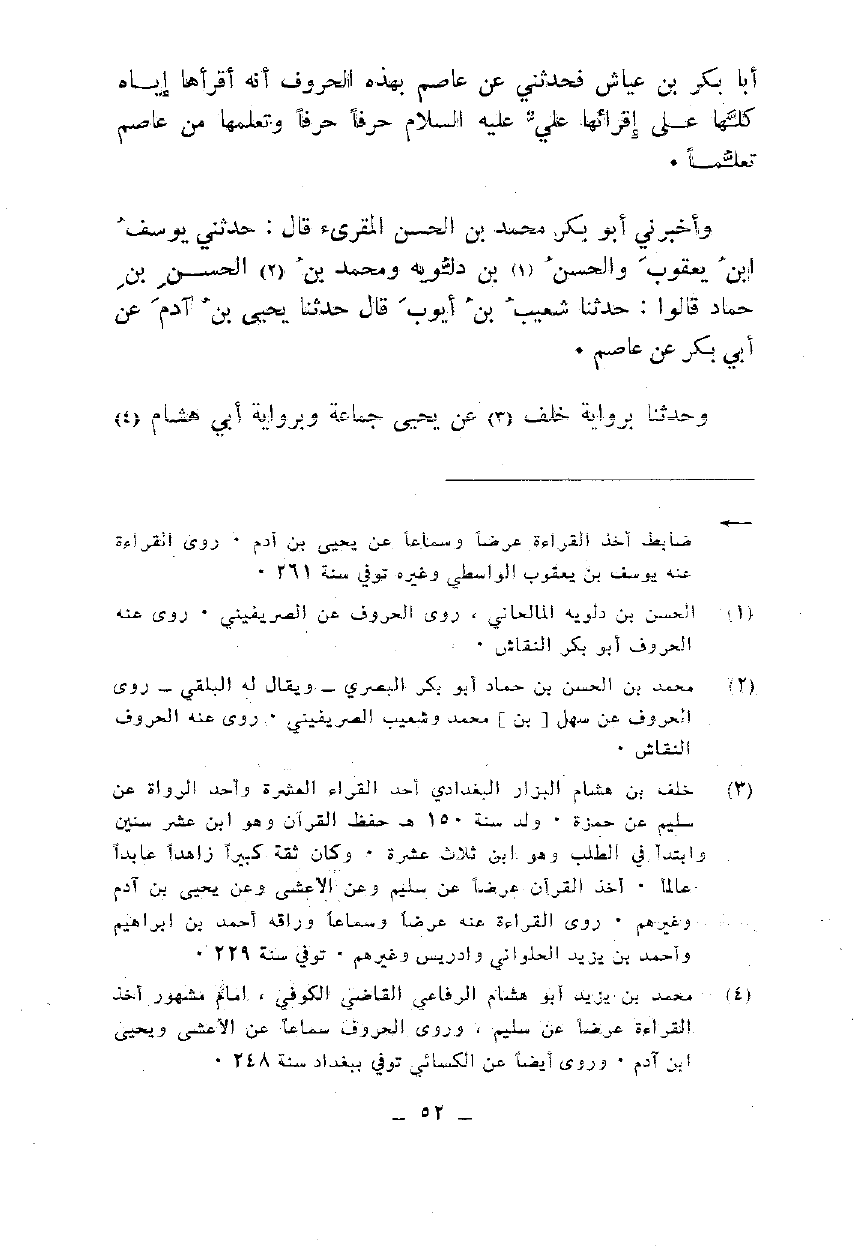 أبا بكر بن عياش فحدثني عن عاصم بهذه الحروف أنه أقرأها إياه كلها على إقرائها علي عليه السلام حرفا حرفا وتعلمها من عاصم تعلما.