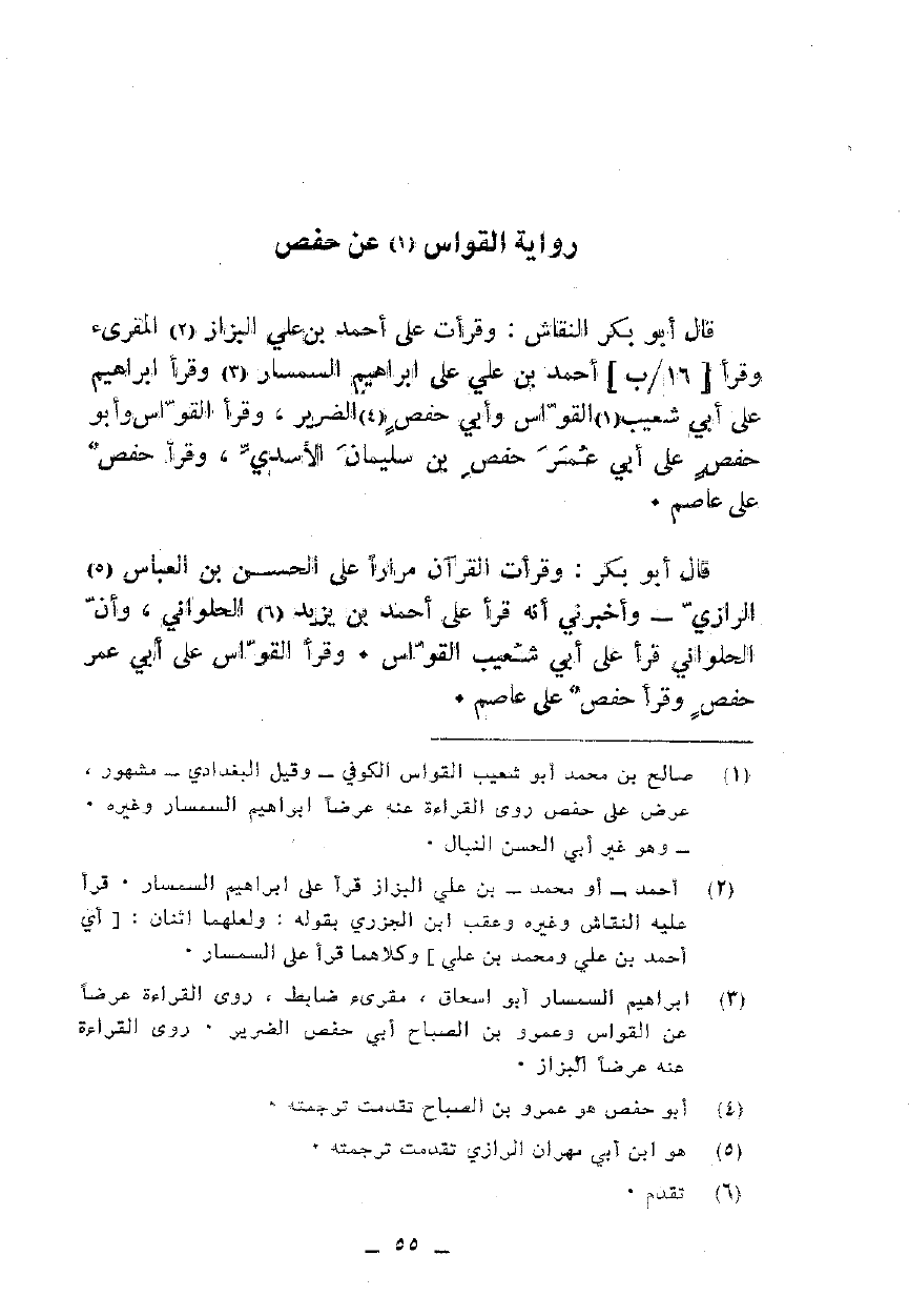 قال أبو بكر: وقرأت القرآن مراراً على الحسن بن العباس الرازي - وأخبرني أنه قرأ على أحمد بن يزيد الحلواني، وأن الحلواني قرأ على أبي شعيب القواس. وقرأ القواس على أبي عمر حفص وقرأ حفص على عاصم.