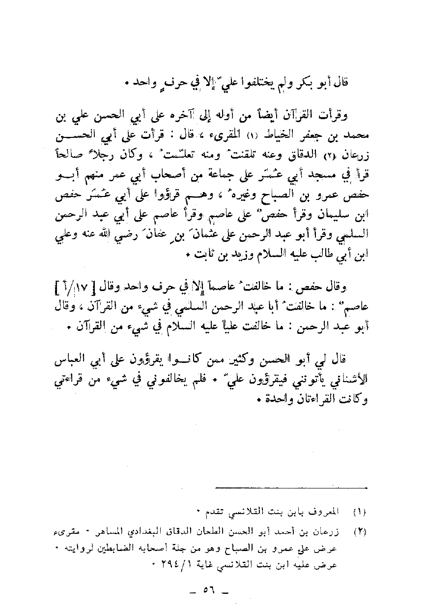 وقرأت القرآن أيضا من أوله إلى آخره على أبي الحسن علي بن محمد بن جعفر الخياط المقرئ، قال: قرأت على أبي الحسن زرعان الدقاق وعنه تلقنت ومنه تعلمت، وكان رجلا صالحا قرأ في مسجد أبي عمر على جماعة من أصحاب أبي عمر منهم أبو حفص عمرو بن الصباح وغيره، وهم قرؤوا على أبي عمر حفص ابن سليمان وقرأ حفص على عاصم وقرأ عاصم على أبي عبد الرحمن السلمي وقرأ أبو عبد الرحمن على عثمان بن عفان رضي الله عنه وعلي ابن أبي طالب عليه السلام وزيد بن ثابت.