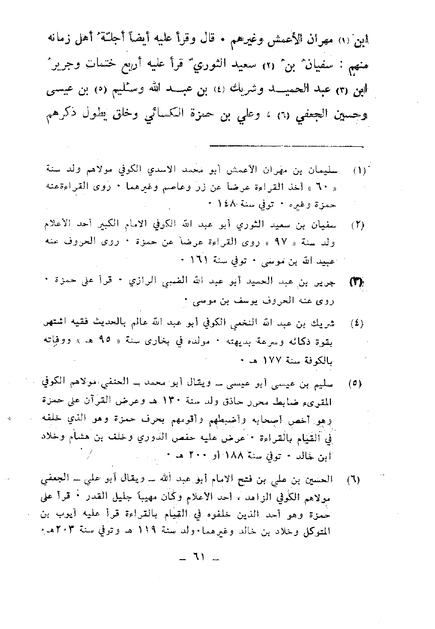 ابن مهران الأعمش وغيرهم. قال وقرأ عليه أيضاً أجلة أهل زمانه منهم: سفيان بن سعيد الثوري قرأ عليه أربع ختمات وجرير ابن عبد الحميد وشريك بن عبد الله وسليم بن عيسى وحسين الجعفي، وعلي بن حمزة الكسائي وخلق يطول ذكرهم