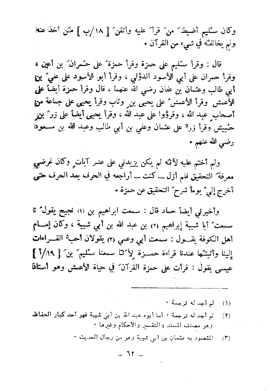 وأخبرني أيضا حماد قال: سمعت إبراهيم بن نجيح يقول: سمعت أبا شيبة إبراهيم بن عبد الله بن أبي شيبة، وكان إمام أهل الكوفة يقول: سمعت أبي وعمي يقولان أحب القراءات إلينا وأثبتها عندنا قراءة حمزة لأنا سمعنا سليم بن عيسى يقول: قرأت على حمزة القرآن في حياة الأعمش وهو أستاذ