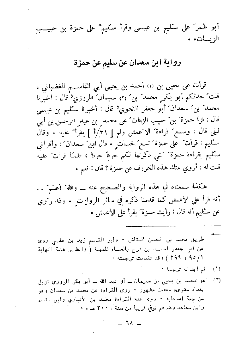 قرأت على يحيى بن أحمد بن يحيى أبي القاسم القضباني، قلت حدثكم أبو بكر محمد بن سليمان المروزي قال: أخبرنا محمد بن سعدان أبو جعفر النحوي قال: أخبرنا سليم بن عيسى قال: قرأ حمزة بن حبيب الزيات على محمد بن عبد الرحمن بن أبي ليلى قال: وسمع قراءة الأعمش ولم يقرأ عليه. وقال سليم: قرأت على حمزة تسع ختمات. قال ابن سعدان: وأقرأني سليم بقراءة حمزة التي ذكرتها لكم حرفا حرفا، فلما قرأت عليه قلت له: أروي عنك هذه الحروف عن حمزة؟ قال: نعم.