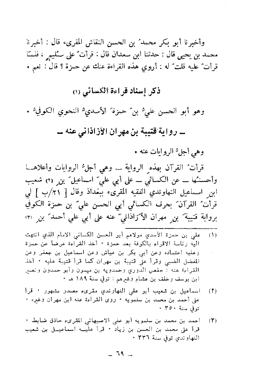 قرأت القرآن بهذه الرواية - وهي أجل الروايات وأعلاها وأحسنها - عن الكسائي - على أبي علي إسماعيل بن شعي ابن إسماعيل النهاوندي الفقيه المقرئ بغداذ وقال لي قرأت القرآن بحرف الكسائي أبي الحسن علي بن حمزة الكوفي برواية قتيبة بن مهران الأزاذاني عنه على أبي علي أحمد بن