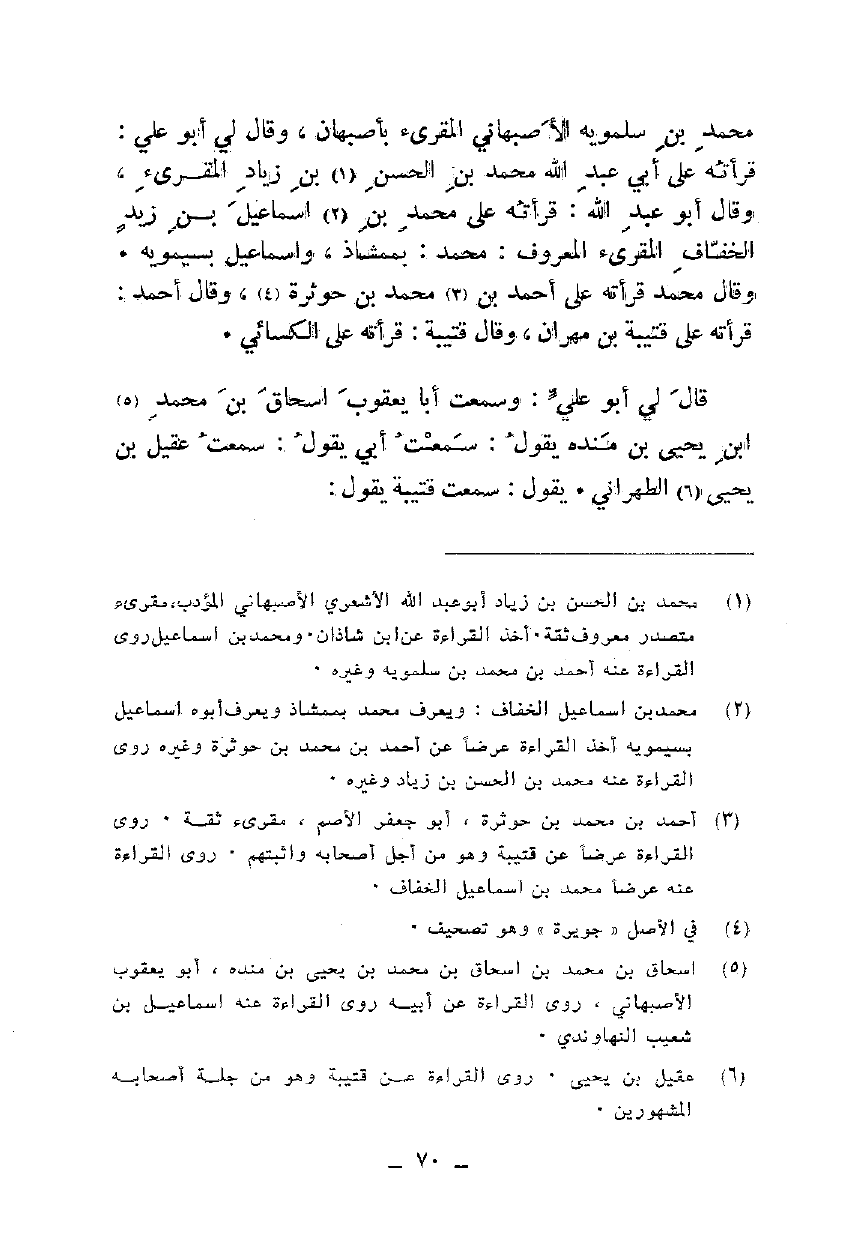محمد بن سلمويه الأصبهاني المقرئ بأصبهان، وقال لي أبو علي: قرأته على أبي عبد الله محمد بن الحسن بن زياد المقرئ، وقال أبو عبد الله: قرأته على محمد بن إسماعيل بن زيد الخفاف المقرئ المعروف: محمد: بممشاذ، وإسماعيل بسيمويه. وقال محمد قرأته على أحمد بن محمد بن حوثرة، وقال أحمد: قرأته على قتيبة بن مهران، وقال قتيبة: قرأته على الكسائي.