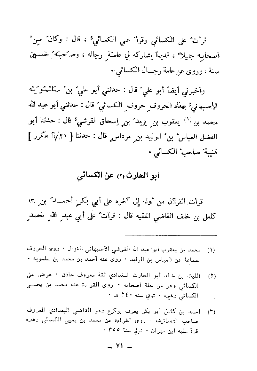 وأخبرني أيضاً أبو علي قال: حدثني أبو علي بن سلمويه الأصبهاني بهذه الحروف حروف الكسائي قال: حدثني أبو عبد الله محمد بن يعقوب بن يزيد بن إسحاق القرشي قال: حدثنا أبو الفضل العباس بن الوليد بن مرداس قال: حدثنا قتيبة صاحب الكسائي.