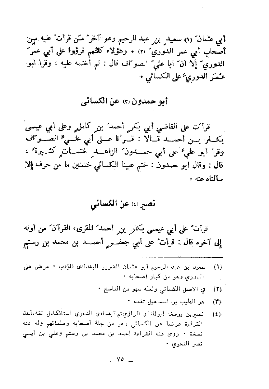 أبي عثمان سعيد بن عبد الرحيم وهو آخر من قرأت عليه من أصحاب أبي عمر الدوري. وهؤلاء كلهم قرؤوا على أبي عمر الدوري إلا أن أبا علي الصواف قال: لم أختمه عليه، وقرأ أبو عمر الدوري على الكسائي.