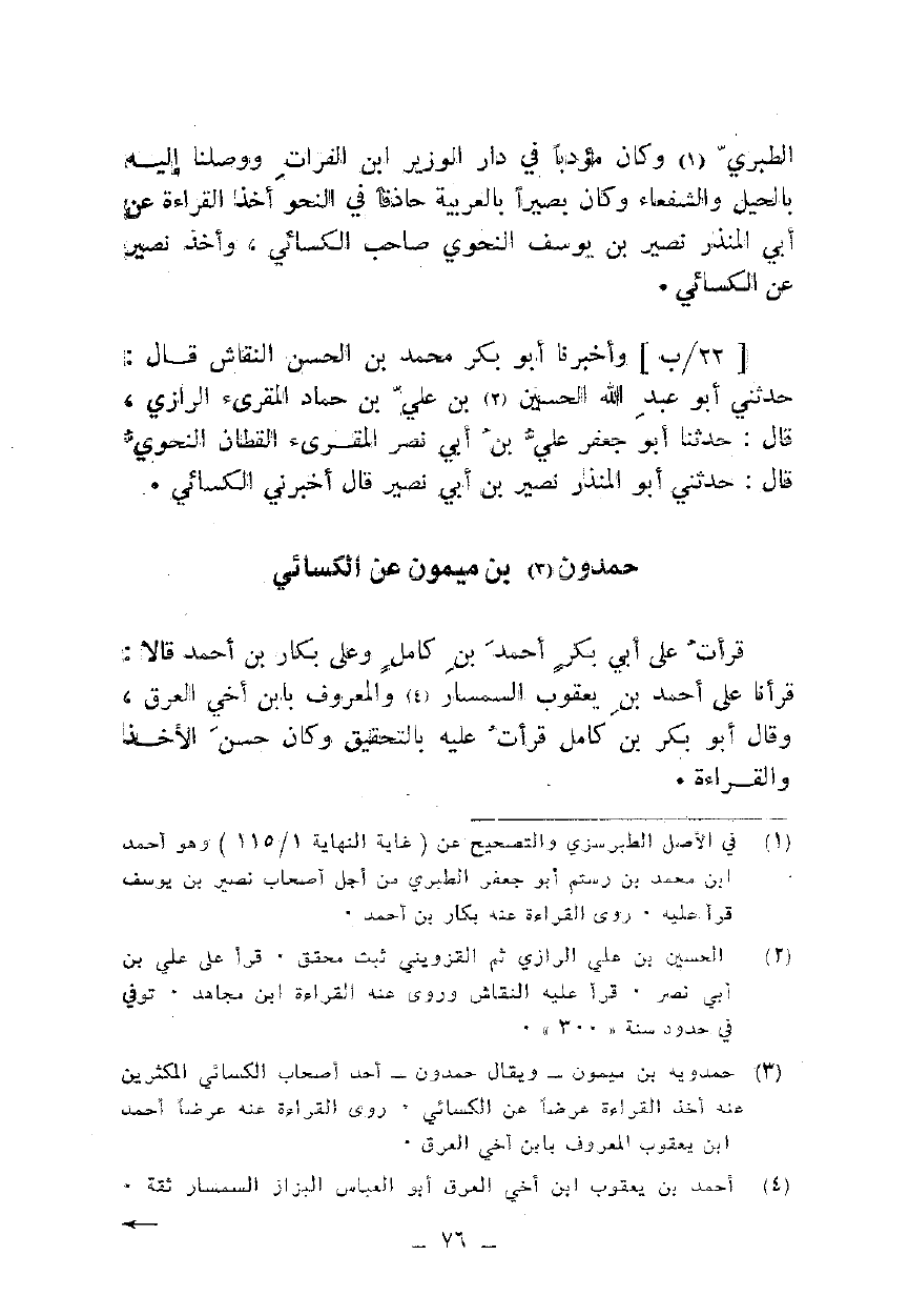 وأخبرنا أبو بكر محمد بن الحسن النقاش قال: حدثني أبو عبد الله الحسين بن علي بن حماد المقرئ الرازي، قال: حدثنا أبو جعفر علي بن أبي نصر المقرئ القطان النحوي قال: حدثني أبو المنذر نصير بن أبي نصير قال أخبرني الكسائي.