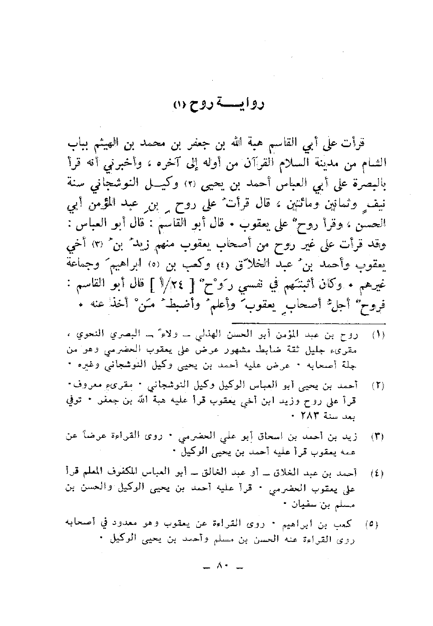 قرأت على أبي القاسم هبة الله بن جعفر بن محمد بن الهيثم بباب الشام من مدينة السلام القرآن من أوله إلى آخره، وأخبرني أنه قرأ بالبصرة على أبي العباس أحمد بن يحيى وكيل النوشجاني نيف وثمانين ومائتين، قال قرأت على روح بن عبد المؤمن أبي الحسن، وقرأ روح على يعقوب. قال أبو القاسم: قال أبو العباس: وقد قرأت على غير روح من أصحاب يعقوب منهم زيد بن أخي يعقوب وأحمد بن عبد الخلاق وكعب بن إبراهيم وجماعة غيرهم. وكان أثبتهم في نفسي روح قال أبو القاسم: فروح أجل أصحاب يعقوب وأعلم وأضبط من أخذ عنه.