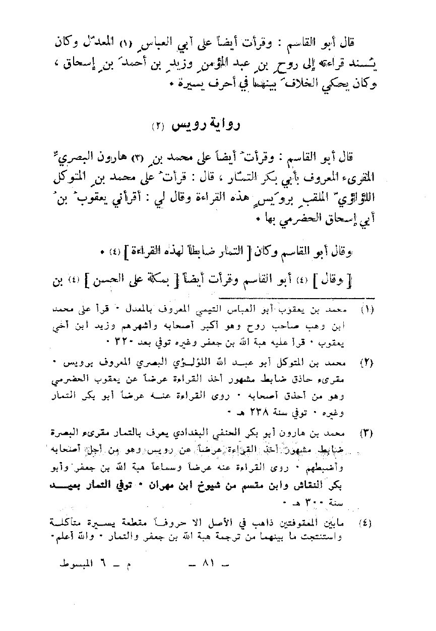 قال أبو القاسم: وقرأت أيضا على محمد بن هارون البصري المقرئ المعروف بأبي بكر التمار، قال: قرأت على محمد بن المتوكل اللؤلؤي الملقب برويس هذه القراءة وقال لي: أقرأني يعقوب بن أبي إسحاق الحضرمي بها.