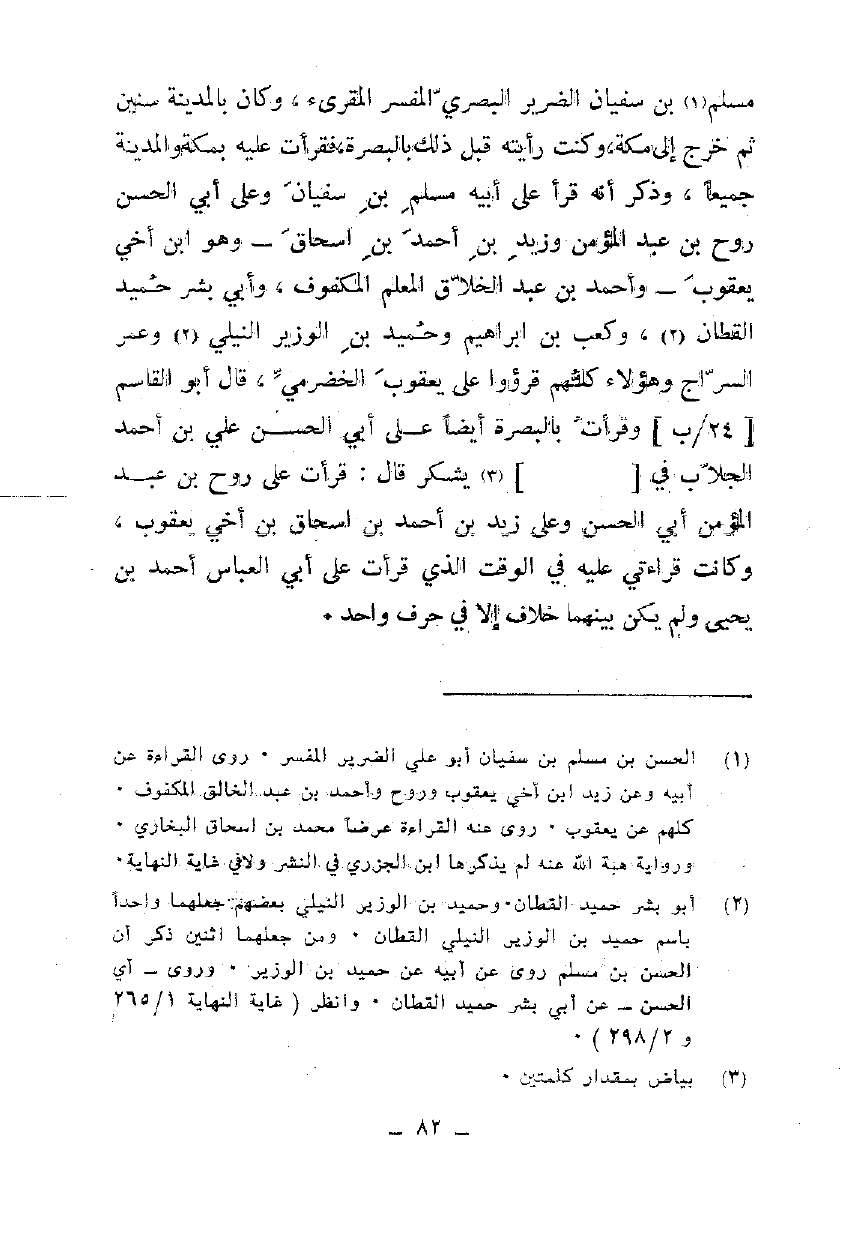 مسلم بن سفيان البصري المفسر المقرئ، وكان بالمدينة سنين ثم خرج إلى مكة، وكنت رأيته قبل ذلك بالبصرة، فقرأت عليه بمكة والمدينة جميعاً، وذكر أنه قرأ على أبيه مسلم بن سفيان وعلى أبي الحسن روح بن عبد المؤمن وزيد بن أحمد بن إسحاق - وهو ابن أخي يعقوب - وأحمد بن عبد الخلاق المعلم المكفوف، وأبي بشر حميد القطان، وكعب بن إبراهيم وحميد بن الوزير النيلي وعمر السراج وهؤلاء كلهم قرؤوا على يعقوب الخضرمي، قال أبو القاسموقرأت بالبصرة أيضاً على أبي الحسن علي بن أحمد الجلاب في يشكر قال: قرأت على روح بن عبد المؤمن أبي الحسن وعلى زيد بن أحمد بن إسحاق بن أخي يعقوب، وكانت قراءتي عليه في الوقت الذي قرأت على أبي العباس أحمد بن يحيى ولم يكن بينهما خلاف إلا في حرف واحد.