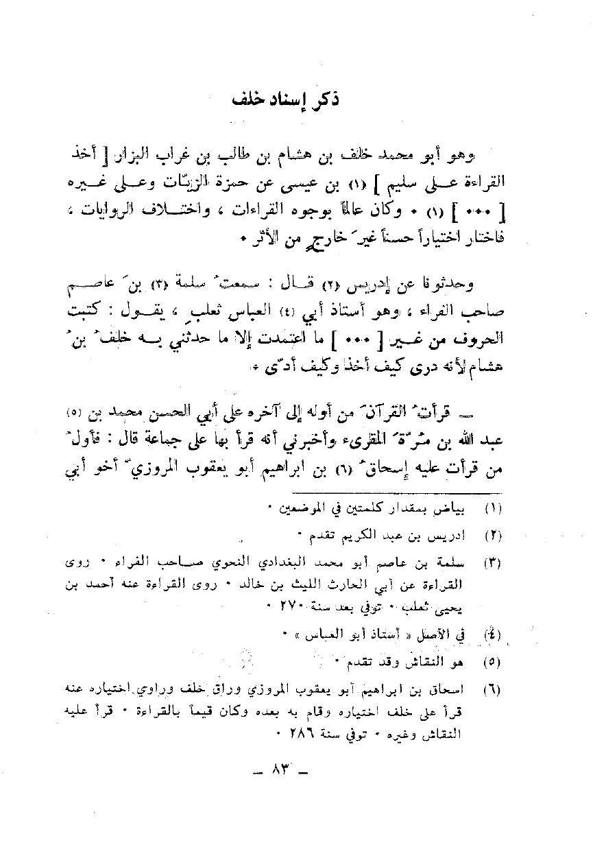 وحدثونا عن إدريس قال: سمعت سلمة بن عاصم صاحب الفراء، وهو أستاذ أبي العباس ثعلب، يقول: كتبت الحروف من غير [ ... ] ما اعتمدت إلا ما حدثني به خلف بن هشام لأنه درى كيف أخذ وكيف أدى.