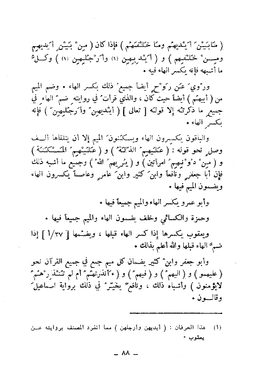 وروي عن روح أيضا جميع ذلك بكسر الهاء. وضم الميم من {أَبِيهِمْ} أيضا حيث كان، والذي قرأت في روايته ضم الهاء في جميع ما ذكرته إلا قوله تعالى {أَيْدِيهِنَّ وَأَرْجُلِهِنَّ} فإنه بكسر الهاء.