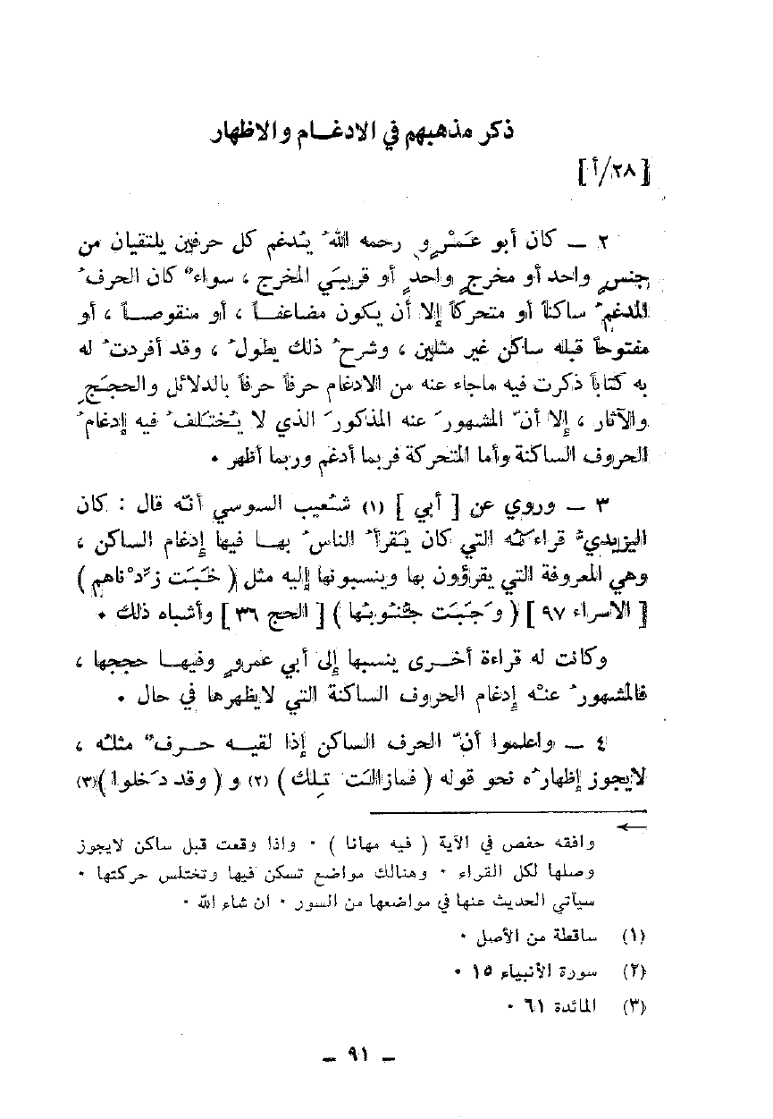 2 - كان أبو عمرو رحمه الله يدغم كل حرفين يلتقيان من جنس واحد أو مخرج واحد أو قريبي المخرج، سواء كان الحرف المدغم ساكنا أو متحركا إلا أن يكون مضاعفا، أو منقوصا، أو مفتوحا قبله ساكن غير مثلين، وشرح ذلك يطول، وقد أفردت له به كتابا ذكرت فيه ما جاء عنه من الإدغام حرفا حرفا بالدلائل والحجج والآثار، إلا أن المشهور عنه المذكور الذي لا يختلف فيه إدغام الحروف الساكنة وأما المتحركة فربما أدغم وربما أظهر.