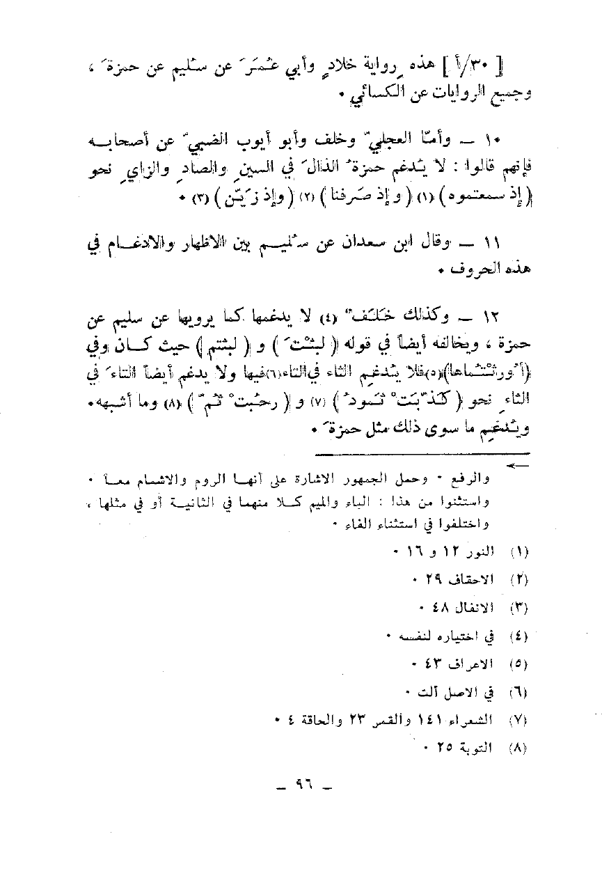 12 - وكذلك خلف لا يدغمها كما يرويها عن سليم عن حمزة، ويخالفه أيضا في قوله {لَبِثْتُ} و {لَبِثْتُمْ} حيث كان وفي {أُورِثْتُمُوهَا} فلا يدغم الثاء في التاء فيها ولا يدغم أيضا التاء في الثاء نحو {كَذَّبَتْ ثَمُودُ} و {رَحُبَتْ ثُمَّ} وما أشبهه. ويدغم ما سوى ذلك مثل حمزة.