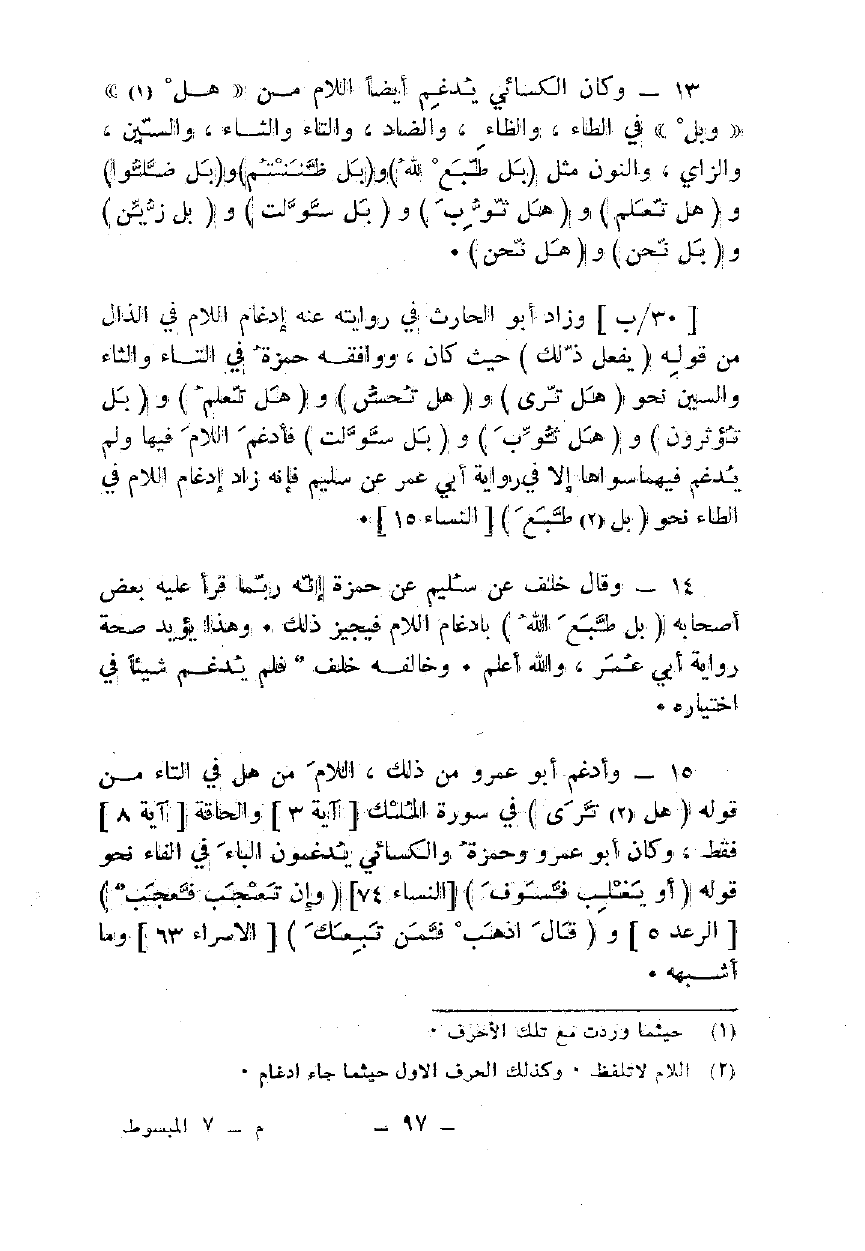 14 - وقال خلف عن سليم عن حمزة إنه ربما قرأ عليه بعض أصحابه {بَلْ طَبَعَ اللَّهُ} بإدغام اللام فيجيز ذلك. وهذا يؤيد صحة رواية أبي عمر، والله أعلم. وخالفه خلف فلم يدغم شيئا في اختياره.