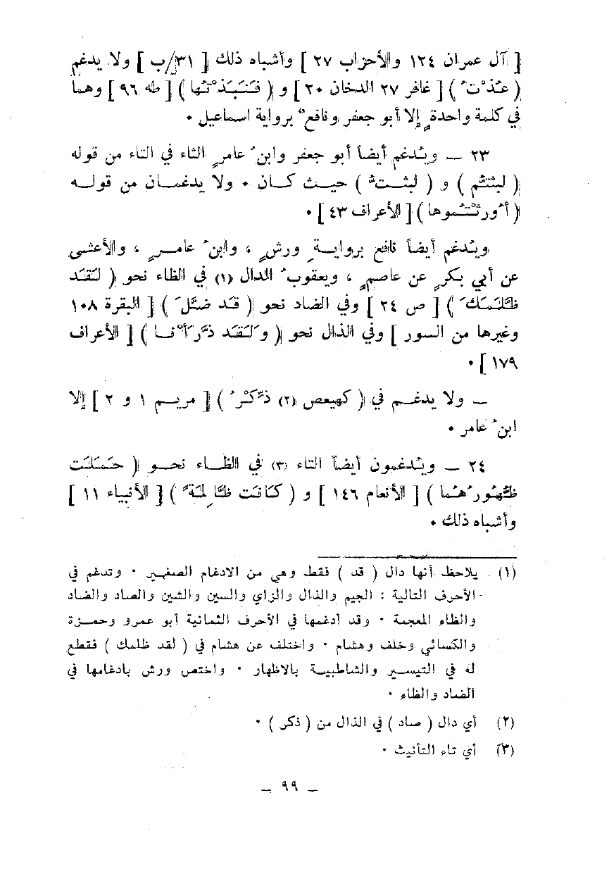 23 - ويدغم أيضا أبو جعفر وابن عامر الثاء في التاء من قوله {لَبِثْتُمْ} و {لَبِثْتَ} حيث كان. ولا يدغمان من قوله {أُورِثْتُمُوهَا} [الأعراف 43].