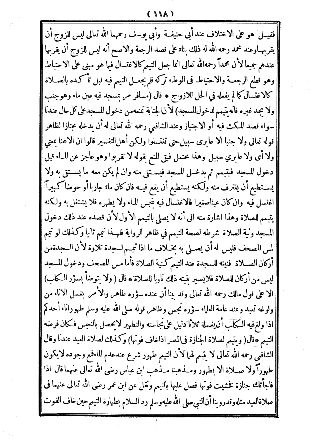 قَالَ (مُسَافِرٌ مَرَّ بِمَسْجِدٍ فِيهِ عَيْنُ مَاءٍ وَهُوَ جُنُبٌ وَلَا يَجِدُ غَيْرَهُ فَإِنَّهُ يَتَيَمَّمُ لِدُخُولِ الْمَسْجِدِ)؛ لِأَنَّ الْجَنَابَةَ تَمْنَعُهُ مِنْ دُخُولِ الْمَسْجِدِ عَلَى كُلِّ حَالٍّ عِنْدَنَا سَوَاءٌ قَصَدَ الْمُكْثَ فِيهِ أَوْ الِاجْتِيَازَ وَعِنْدَ الشَّافِعِيِّ - رَحِمَهُ اللَّهُ تَعَالَى - لَهُ أَنْ يَدْخُلَهُ مُجْتَازًا لِظَاهِرِ قَوْله تَعَالَى {وَلَا جُنُبًا إلَّا عَابِرِي سَبِيلٍ حَتَّى تَغْتَسِلُوا} [النساء: 43] وَلَكِنَّ أَهْلَ التَّفْسِيرِ قَالُوا إنَّ إلَّا هُنَا بِمَعْنَى وَلَا أَيْ وَلَا عَابِرِي سَبِيلٍ وَهَذَا مُحْتَمَلٌ فَبَقِيَ الْمَنْعُ بِقَوْلِهِ لَا تَقْرَبُوا، وَهُوَ عَاجِزٌ عَنْ الْمَاءِ قَبْلَ دُخُولِ الْمَسْجِدِ فَيَتَيَمَّمُ ثُمَّ يَدْخُلُ الْمَسْجِدَ فَيَسْتَقِي مِنْهُ وَإِنْ لَمْ يَكُنْ مَعَهُ مَا يَسْتَقِي بِهِ وَلَا يَسْتَطِيعُ أَنْ يَغْتَرِفَ مِنْهُ وَلَكِنَّهُ يَسْتَطِيعُ أَنْ يَقَعَ فِيهِ فَإِنْ كَانَ مَاءً جَارِيًا أَوْ حَوْضًا كَبِيرًا اغْتَسَلَ فِيهِ، وَإِنْ كَانَ عَيْنًا صَغِيرًا فَالِاغْتِسَالُ فِيهِ يُنَجِّسُ الْمَاءَ وَلَا يُطَهِّرُهُ فَلَا يَشْتَغِلُ بِهِ وَلَكِنَّهُ يَتَيَمَّمُ لِلصَّلَاةِ وَهَذَا إشَارَةٌ مِنْهُ إلَى أَنَّهُ لَا يُصَلِّي بِالتَّيَمُّمِ الْأَوَّلِ؛ لِأَنَّ قَصْدَهُ عِنْدَ ذَلِكَ دُخُولُ الْمَسْجِدِ وَنِيَّةُ الصَّلَاةِ شَرْطُهُ لِصِحَّةِ التَّيَمُّمِ فِي ظَاهِرِ الرِّوَايَةِ فَلِهَذَا تَيَمَّمَ ثَانِيًا وَكَذَلِكَ لَوْ تَيَمَّمَ لِمَسِّ الْمُصْحَفِ فَلَيْسَ لَهُ أَنْ يُصَلِّيَ بِهِ بِخِلَافِ مَا إذَا تَيَمَّمَ لِسَجْدَةِ تِلَاوَةٍ؛ لِأَنَّ السَّجْدَةَ مِنْ أَرْكَانِ الصَّلَاةِ فَنِيَّتُهُ لِلسَّجْدَةِ عِنْدَ التَّيَمُّمِ كَنِيَّةِ الصَّلَاةِ فَأَمَّا مَسُّ الْمُصْحَفِ وَدُخُولُ الْمَسْجِدِ لَيْسَ مِنْ أَرْكَانِ الصَّلَاةِ فَلَا يَصِيرُ بِنِيَّتِهِ ذَلِكَ نَاوِيًا لِلصَّلَاةِ.