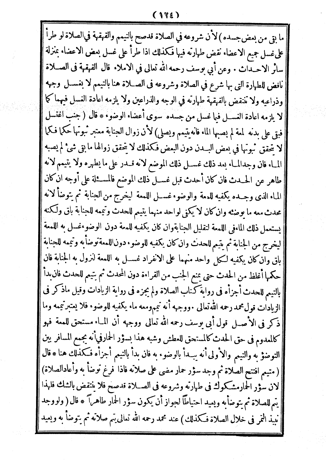 قَالَ (جُنُبٌ اغْتَسَلَ فَبَقِيَ عَلَى بَدَنِهِ لُمْعَةٌ لَمْ يُصِبْهَا فَإِنَّهُ يَتَيَمَّمُ وَيُصَلِّي) لِأَنَّ زَوَالَ الْجَنَابَةِ مُعْتَبَرٌ ثُبُوتُهَا حُكْمًا فَكَمَا لَا يَتَحَقَّقُ ثُبُوتُهَا فِي بَعْضِ الْبَدَنِ دُونَ الْبَعْضِ فَكَذَلِكَ لَا يَتَحَقَّقُ زَوَالُهَا مَا بَقِيَ شَيْءٌ لَمْ يُصِبْهُ الْمَاءُ، فَإِنْ وَجَدَ الْمَاءَ بَعْدَ ذَلِكَ غَسَلَ ذَلِكَ الْمَوْضِعَ؛ لِأَنَّهُ قَدَرَ عَلَى مَا يُطَهِّرُهُ وَلَا يَتَيَمَّمُ؛ لِأَنَّهُ طَاهِرٌ عَنْ الْحَدَثِ فَإِنْ كَانَ أَحْدَثَ قَبْلَ غَسْلِ ذَلِكَ الْمَوْضِعِ فَالْمَسْأَلَةُ عَلَى أَوْجُهٍ إنْ كَانَ الْمَاءُ الَّذِي وَجَدَهُ يَكْفِيهِ لِلُّمْعَةِ وَالْوُضُوءِ غَسَلَ اللُّمْعَةَ لِيَخْرُجَ مِنْ الْجَنَابَةِ ثُمَّ يَتَوَضَّأُ؛ لِأَنَّهُ مُحْدِثٌ مَعَهُ مَا يُوَضِّئهُ، وَإِنْ كَانَ لِوَاحِدٍ مِنْهُمَا يَتَيَمَّمُ لِلْحَدَثِ وَتَيَمُّمُهُ لِلْجَنَابَةِ بَاقٍ وَلَكِنَّهُ يَسْتَعْمِلُ ذَلِكَ الْمَاءَ فِي اللُّمْعَةِ لِتَقْلِيلِ الْجَنَابَةِ وَإِنْ كَانَ يَكْفِيهِ لِلُّمْعَةِ دُونَ الْوُضُوءِ غَسَلَ بِهِ اللُّمْعَةَ لِيَخْرُجَ مِنْ الْجَنَابَةِ ثُمَّ يَتَيَمَّمُ لِلْحَدَثِ، وَإِنْ كَانَ يَكْفِيهِ لِلْوُضُوءِ دُونَ اللُّمْعَةِ تَوَضَّأَ بِهِ وَتَيَمُّمُهُ لِلْجَنَابَةِ بَاقٍ، وَإِنْ كَانَ يَكْفِيهِ لِكُلِّ وَاحِدٍ مِنْهُمَا عَلَى الِانْفِرَادِ غَسَلَ بِهِ اللُّمْعَةَ لِتَزُولَ بِهِ الْجَنَابَةُ فَإِنَّ حُكْمَهَا أَغْلَظُ مِنْ الْحَدَثِ حَتَّى يُمْنَعَ الْجُنُبُ مِنْ الْقِرَاءَةِ دُونَ الْمُحْدِثِ ثُمَّ يَتَيَمَّمُ لِلْحَدَثِ فَإِنْ بَدَأَ بِالتَّيَمُّمِ لِلْحَدَثِ أَجْزَأَهُ فِي رِوَايَةِ كِتَابِ الصَّلَاةِ وَلَمْ يُجْزِهِ فِي رِوَايَةِ الزِّيَادَاتِ وَقِيلَ مَا ذُكِرَ فِي الزِّيَادَاتِ قَوْلُ مُحَمَّدٍ - رَحِمَهُ اللَّهُ تَعَالَى -. وَوَجْهُهُ أَنَّهُ تَيَمَّمَ وَمَعَهُ مَاءٌ يَكْفِيهِ لِلْوُضُوءِ فَلَا يُعْتَبَرُ تَيَمُّمُهُ وَمَا ذُكِرَ فِي الْأَصْلِ قَوْلُ أَبِي يُوسُفَ - رَحِمَهُ اللَّهُ تَعَالَى - وَوَجْهُهُ أَنَّ الْمَاءَ مُسْتَحَقٌّ لِلُّمْعَةِ فَهُوَ كَالْمَعْدُومِ فِي حَقِّ الْحَدَثِ كَالْمُسْتَحِقِّ لِلْعَطَشِ، وَشُبِّهَ هَذَا بِسُؤْرِ الْحِمَارِ فِي أَنَّهُ يَجْمَعُ الْمُسَافِرُ بَيْنَ التَّوَضُّؤِ بِهِ وَالتَّيَمُّمِ وَالْأَوْلَى أَنَّهُ يَبْدَأُ بِالْوُضُوءِ بِهِ فَإِنْ بَدَأَ بِالتَّيَمُّمِ أَجْزَأَهُ فَكَذَلِكَ هُنَا.