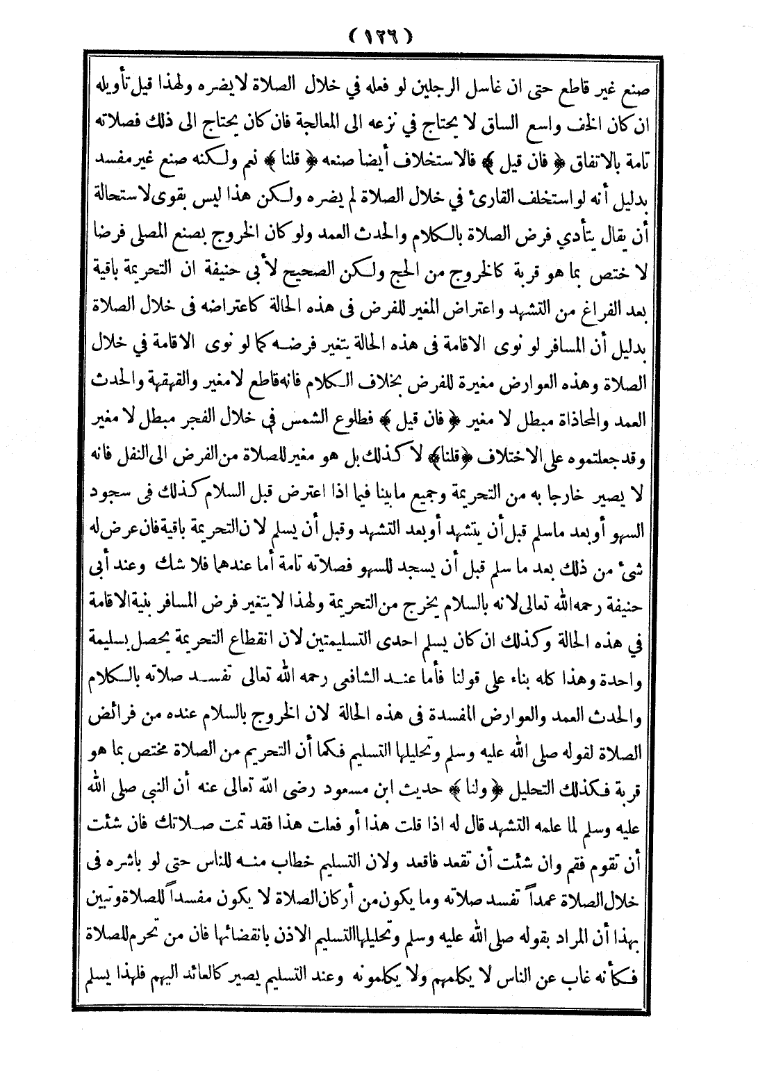 صُنْعٌ غَيْرُ قَاطِعٍ حَتَّى أَنَّ غَاسِلَ الرِّجْلَيْنِ لَوْ فَعَلَهُ فِي خِلَالِ الصَّلَاةِ لَا يَضُرُّهُ وَلِهَذَا قِيلَ تَأْوِيلُهُ إنْ كَانَ الْخُفَّ وَاسِعَ السَّاقِ لَا يَحْتَاجُ فِي نَزْعِهِ إلَى الْمُعَالَجَةِ فَإِنْ كَانَ يَحْتَاجُ إلَى ذَلِكَ فَصَلَاتُهُ تَامَّةٌ بِالِاتِّفَاقِ (فَإِنْ قِيلَ) فَالِاسْتِخْلَافُ أَيْضًا صُنْعُهُ (قُلْنَا) نَعَمْ وَلَكِنَّهُ صُنْعٌ غَيْرُ مُفْسِدٍ بِدَلِيلِ أَنَّهُ لَوْ اسْتَخْلَفَ الْقَارِئُ فِي خِلَالِ الصَّلَاةِ لَمْ يَضُرَّهُ وَلَكِنَّ هَذَا لَيْسَ بِقَوِيٍّ لِاسْتِحَالَةِ أَنْ يُقَالَ يَتَأَدَّى فَرْضُ الصَّلَاةِ بِالْكَلَامِ وَالْحَدَثِ الْعَمْدِ وَلَوْ كَانَ الْخُرُوجُ بِصُنْعِ الْمُصَلِّي فَرْضًا لَاخْتَصَّ بِمَا هُوَ قُرْبَةٌ كَالْخُرُوجِ مِنْ الْحَجِّ وَلَكِنَّ الصَّحِيحَ لِأَبِي حَنِيفَةَ أَنَّ التَّحْرِيمَةَ بَاقِيَةٌ بَعْدَ الْفَرَاغِ مِنْ التَّشَهُّدِ، وَاعْتِرَاضُ الْمُغَيِّرِ لِلْفَرْضِ فِي هَذِهِ الْحَالَةِ كَاعْتِرَاضِهِ فِي خِلَالِ الصَّلَاةِ بِدَلِيلِ أَنَّ الْمُسَافِرَ لَوْ نَوَى الْإِقَامَةَ فِي هَذِهِ الْحَالَةِ يَتَغَيَّرُ فَرْضُهُ كَمَا لَوْ نَوَى الْإِقَامَةَ فِي خِلَالِ الصَّلَاةِ وَهَذِهِ الْعَوَارِضُ مُغَيِّرَةٌ لِلْفَرْضِ بِخِلَافِ الْكَلَامِ فَإِنَّهُ قَاطِعٌ لَا مُغَيِّرٌ وَالْقَهْقَهَةُ وَالْحَدَثُ الْعَمْدُ وَالْمُحَاذَاةُ مُبْطِلٌ لَا مُغَيِّرٌ (فَإِنْ قِيلَ) فَطُلُوعُ الشَّمْسِ فِي خِلَالِ الْفَجْرِ مُبْطِلٌ لَا مُغَيِّرٌ وَقَدْ جَعَلْتُمُوهُ عَلَى الِاخْتِلَافِ.