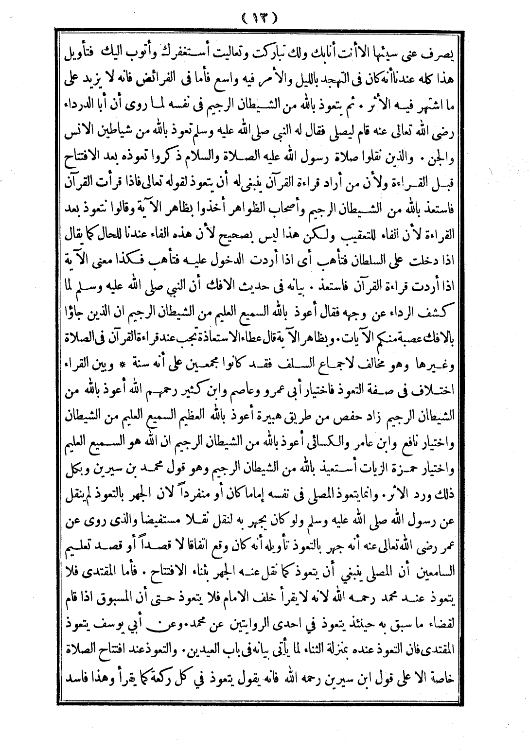 ثُمَّ يَتَعَوَّذُ بِاَللَّهِ مِنْ الشَّيْطَانِ الرَّجِيمِ فِي نَفْسِهِ لِمَا رُوِيَ أَنَّ أَبَا الدَّرْدَاءِ - رَضِيَ اللَّهُ تَعَالَى عَنْهُ - قَامَ لِيُصَلِّيَ فَقَالَ لَهُ النَّبِيُّ - صَلَّى اللَّهُ عَلَيْهِ وَسَلَّمَ -: «تَعَوَّذْ بِاَللَّهِ مِنْ شَيَاطِينِ الْإِنْسِ وَالْجِنِّ»، وَاَلَّذِينَ نَقَلُوا صَلَاةَ رَسُولِ اللَّهِ - عَلَيْهِ الصَّلَاةُ وَالسَّلَامُ - ذَكَرُوا تَعَوُّذَهُ بَعْدَ الِافْتِتَاحِ قَبْلَ الْقِرَاءَةِ وَلِأَنَّ مَنْ أَرَادَ قِرَاءَةَ الْقُرْآنِ يَنْبَغِي لَهُ أَنْ يَتَعَوَّذَ لِقَوْلِهِ تَعَالَى: {فَإِذَا قَرَأْتَ الْقُرْآنَ فَاسْتَعِذْ بِاَللَّهِ مِنْ الشَّيْطَانِ الرَّجِيمِ} [النحل: 98] وَأَصْحَابُ الظَّوَاهِرِ أَخَذُوا بِظَاهِرِ الْآيَةِ وَقَالُوا نَتَعَوَّذُ بَعْدَ الْقِرَاءَةِ؛ لِأَنَّ الْفَاءَ لِلتَّعْقِيبِ وَلَكِنَّ هَذَا لَيْسَ بِصَحِيحٍ؛ لِأَنَّ هَذِهِ الْفَاءَ عِنْدَنَا لِلْحَالِ كَمَا يُقَالُ إذَا دَخَلْتَ عَلَى السُّلْطَانِ فَتَأَهَّبْ أَيْ إذَا أَرَدْتَ الدُّخُولَ عَلَيْهِ فَتَأَهَّبْ فَكَذَا مَعْنَى الْآيَةِ إذَا أَرَدْتَ قِرَاءَةَ الْقُرْآنِ فَاسْتَعِذْ، بَيَانُهُ فِي حَدِيثِ الْإِفْكِ: «أَنَّ النَّبِيَّ - صَلَّى اللَّهُ عَلَيْهِ وَسَلَّمَ - لَمَّا كَشَفَ الرِّدَاءَ عَنْ وَجْهِهِ فَقَالَ أَعُوذُ بِاَللَّهِ السَّمِيعِ الْعَلِيمِ مِنْ الشَّيْطَانِ الرَّجِيمِ»: {إنَّ الَّذِينَ جَاءُوا بِالْإِفْكِ عُصْبَةٌ مِنْكُمْ} [النور: 11] الْآيَاتِ، وَبِظَاهِرِ الْآيَةِ قَالَ عَطَاءٌ الِاسْتِعَاذَةُ تَجِبُ عِنْدَ قِرَاءَةِ الْقُرْآنِ فِي الصَّلَاةِ وَغَيْرِهَا وَهُوَ مُخَالِفٌ لِإِجْمَاعِ السَّلَفِ فَقَدْ كَانُوا مُجْمِعِينَ عَلَى أَنَّهُ سُنَّةٌ وَبَيْنَ الْقُرَّاءِ اخْتِلَافٌ فِي صِفَةِ التَّعَوُّذِ فَاخْتِيَارُ أَبِي عَمْرٍو وَعَاصِمٍ وَابْنِ كَثِيرٍ - رَحِمَهُمُ اللَّهُ - أَعُوذُ بِاَللَّهِ مِنْ الشَّيْطَانِ الرَّجِيمِ زَادَ حَفْصٌ مِنْ طَرِيقِ هُبَيْرَةَ أَعُوذُ بِاَللَّهِ الْعَظِيمِ السَّمِيعِ الْعَلِيمِ مِنْ الشَّيْطَانِ، وَاخْتِيَارُ نَافِعٍ وَابْنِ عَامِرٍ وَالْكِسَائِيِّ أَعُوذُ بِاَللَّهِ مِنْ الشَّيْطَانِ الرَّجِيمِ إنَّ اللَّهَ هُوَ السَّمِيعُ الْعَلِيمُ، وَاخْتِيَارُ حَمْزَةَ الزَّيَّاتِ أَسْتَعِيذُ بِاَللَّهِ مِنْ الشَّيْطَانِ الرَّجِيمِ. وَهُوَ قَوْلُ مُحَمَّدِ بْنِ سِيرِينَ وَبِكُلِّ ذَلِكَ وَرَدَ الْأَثَرُ.