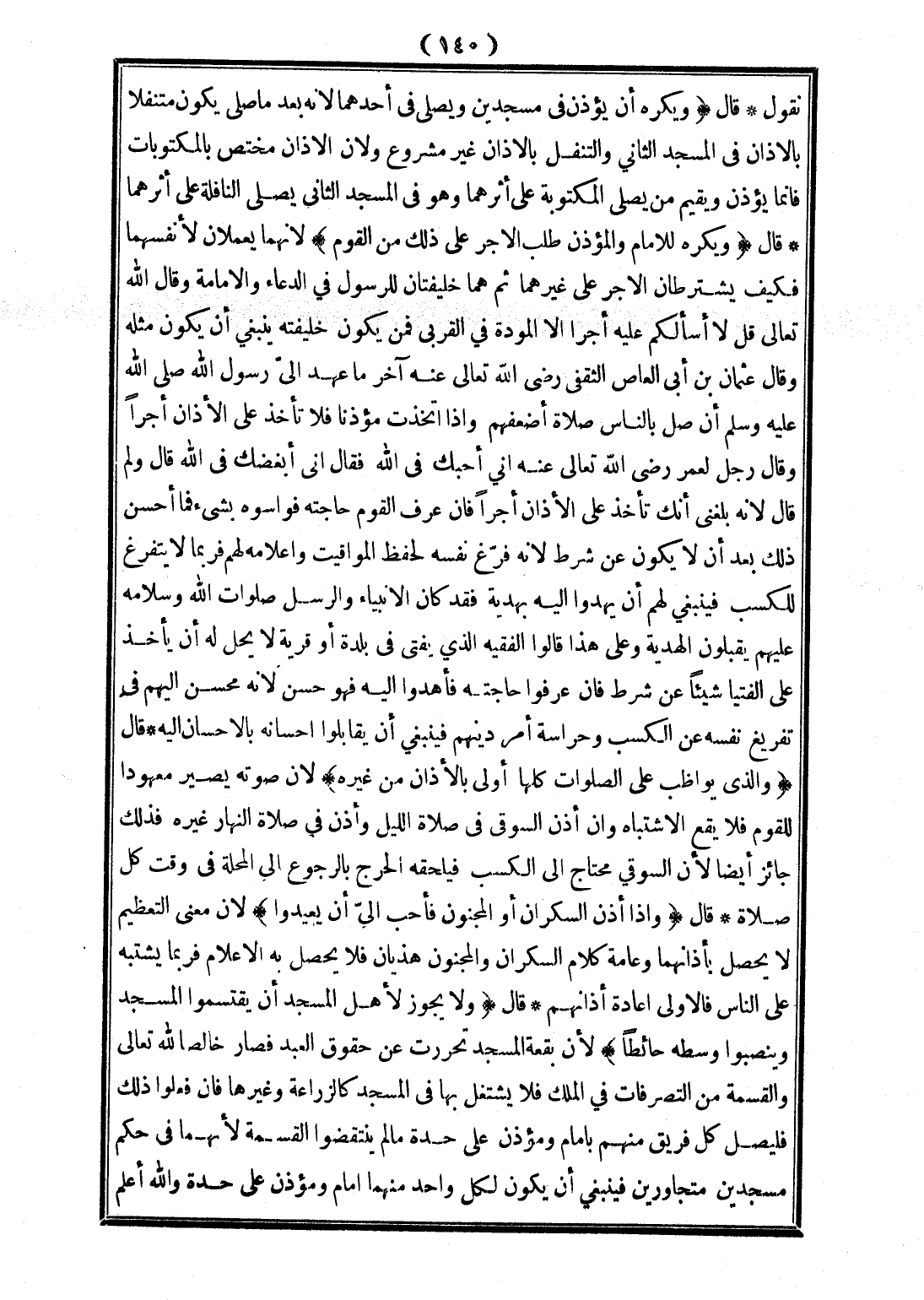 وَقَالَ عُثْمَانُ بْنُ أَبِي الْعَاصِ الثَّقَفِيُّ - رَضِيَ اللَّهُ تَعَالَى عَنْهُ - آخِرُ مَا عَهِدَ إلَيَّ رَسُولُ اللَّهِ - صَلَّى اللَّهُ عَلَيْهِ وَسَلَّمَ - أَنْ صَلِّ بِالنَّاسِ صَلَاةَ أَضْعَفِهِمْ وَإِذَا اُتُّخِذْت مُؤَذِّنًا فَلَا تَأْخُذْ عَلَى الْأَذَانِ أَجْرًا وَقَالَ رَجُلٌ لِعُمَرَ - رَضِيَ اللَّهُ تَعَالَى عَنْهُ -: إنِّي أُحِبُّك فِي اللَّهِ. فَقَالَ: إنِّي أُبْغِضُك فِي اللَّهِ. قَالَ: وَلِمَ؟ قَالَ: لِأَنَّهُ بَلَغَنِي أَنَّك تَأْخُذُ عَلَى الْأَذَانِ أَجْرًا فَإِنْ عَرَفَ الْقَوْمُ حَاجَتَهُ فَوَاسَوْهُ بِشَيْءٍ فَمَا أَحْسَنَ ذَلِكَ بَعْدَ أَنْ لَا يَكُونَ عَنْ شَرْطٍ؛ لِأَنَّهُ فَرَّغَ نَفْسَهُ لِحِفْظِ الْمَوَاقِيتِ وَإِعْلَامِهِ لَهُمْ فَرُبَّمَا لَا يَتَفَرَّغُ لِلْكَسْبِ فَيَنْبَغِي لَهُمْ أَنْ يُهْدُوا إلَيْهِ بِهَدِيَّةٍ فَقَدْ كَانَ الْأَنْبِيَاءُ وَالرُّسُلُ صَلَوَاتُ اللَّهِ وَسَلَامُهُ عَلَيْهِمْ يَقْبَلُونَ الْهَدِيَّةَ وَعَلَى هَذَا قَالُوا الْفَقِيهُ الَّذِي يُفْتِي فِي بَلْدَةٍ أَوْ قَرْيَةٍ لَا يَحِلُّ لَهُ أَنْ يَأْخُذَ عَلَى الْفُتْيَا شَيْئًا عَنْ شَرْطٍ فَإِنْ عَرَفُوا حَاجَتَهُ فَأَهْدَوْا إلَيْهِ فَهُوَ حَسَنٌ؛ لِأَنَّهُ مُحْسِنٌ إلَيْهِمْ فِي تَفْرِيغِ نَفْسِهِ عَنْ الْكَسْبِ وَحِرَاسَةِ أَمْرِ دِينِهِمْ فَيَنْبَغِي أَنْ يُقَابِلُوا إحْسَانَهُ بِالْإِحْسَانِ إلَيْهِ
