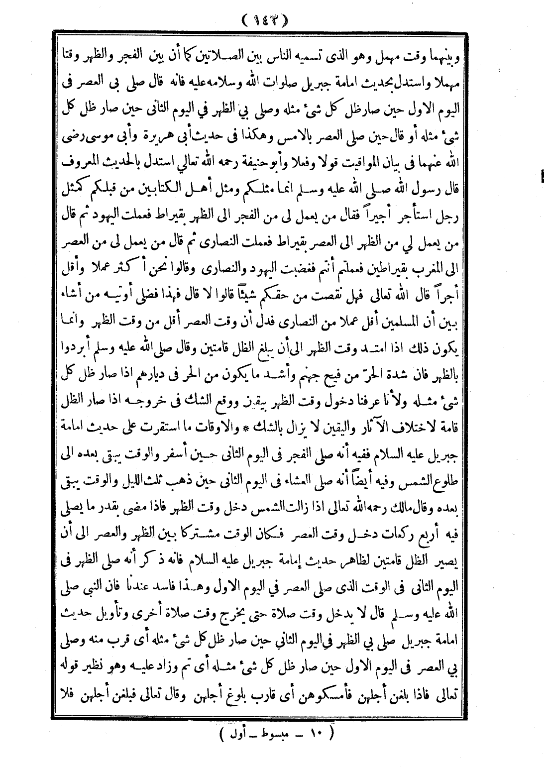 ، كَمَا أَنَّ بَيْنَ الْفَجْرِ وَالظُّهْرِ وَقْتًا مُهْمَلًا وَاسْتَدَلَّ بِحَدِيثِ «إمَامَةِ جِبْرِيلَ - صَلَوَاتُ اللَّهِ وَسَلَامُهُ عَلَيْهِ - فَإِنَّهُ قَالَ صَلَّى بِي الْعَصْرَ فِي الْيَوْمِ الْأَوَّلِ حِينَ صَارَ ظِلُّ كُلِّ شَيْءٍ مِثْلَهُ وَصَلَّى بِي الظُّهْرَ فِي الْيَوْمِ الثَّانِي حِينَ صَارَ ظِلُّ كُلِّ شَيْءٍ مِثْلَهُ أَوْ قَالَ حِينَ صَلَّى الْعَصْرَ بِالْأَمْسِ» وَهَكَذَا فِي حَدِيثِ أَبِي هُرَيْرَةَ وَأَبِي مُوسَى - رَضِيَ اللَّهُ عَنْهُمَا - فِي بَيَانِ الْمَوَاقِيتِ قَوْلًا وَفِعْلًا، وَأَبُو حَنِيفَةَ - رَحِمَهُ اللَّهُ تَعَالَى - اسْتَدَلَّ بِالْحَدِيثِ الْمَعْرُوفِ قَالَ رَسُولُ اللَّهِ - صَلَّى اللَّهُ عَلَيْهِ وَسَلَّمَ - «إنَّمَا مَثَلُكُمْ وَمَثَلُ أَهْلِ الْكِتَابَيْنِ مِنْ قَبْلِكُمْ كَمَثَلِ رَجُلٍ اسْتَأْجَرَ أَجِيرًا فَقَالَ مَنْ يَعْمَلُ لِي مِنْ الْفَجْرِ إلَى الظُّهْرِ بِقِيرَاطٍ فَعَمِلَتْ الْيَهُودُ ثُمَّ قَالَ مَنْ يَعْمَلُ لِي مِنْ الظُّهْرِ إلَى الْعَصْرِ فَعَمِلَتْ النَّصَارَى ثُمَّ قَالَ مَنْ يَعْمَلُ لِي مِنْ الْعَصْرِ إلَى الْمَغْرِبِ بِقِيرَاطَيْنِ فَعَمِلْتُمْ أَنْتُمْ فَغَضِبَتْ الْيَهُودُ وَالنَّصَارَى وَقَالُوا نَحْنُ أَكْثَرُ عَمَلًا وَأَقَلُّ أَجْرًا قَالَ اللَّهُ تَعَالَى فَهَلْ نَقَصْت مِنْ حَقِّكُمْ شَيْئًا قَالُوا لَا قَالَ فَهَذَا فَضْلِي أُوتِيهِ مَنْ أَشَاءُ» بَيَّنَ أَنَّ الْمُسْلِمِينَ أَقَلُّ عَمَلًا مِنْ النَّصَارَى