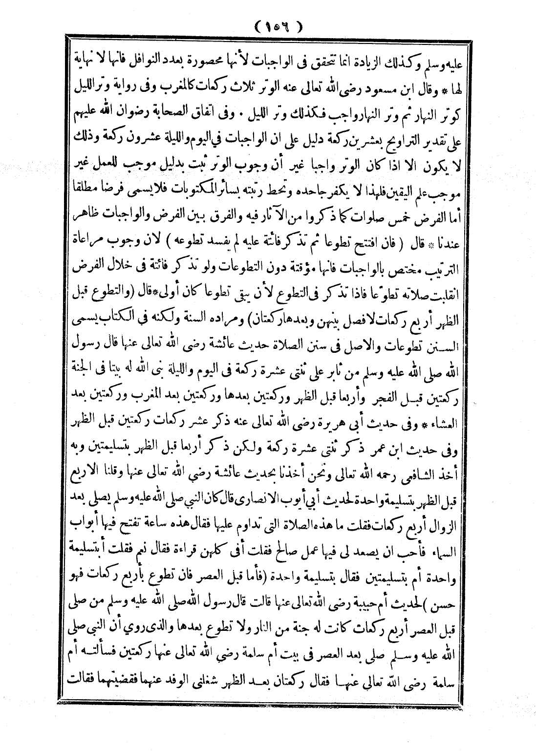 وَكَذَلِكَ الزِّيَادَةُ إنَّمَا تَتَحَقَّقُ فِي الْوَاجِبَاتِ؛ لِأَنَّهَا مَحْصُورَةٌ بِعَدَدِ النَّوَافِلِ فَإِنَّهَا لَا نِهَايَةَ لَهَا وَقَالَ ابْنُ مَسْعُودٍ - رَضِيَ اللَّهُ تَعَالَى عَنْهُ - الْوِتْرُ ثَلَاثُ رَكَعَاتٍ كَالْمَغْرِبِ وَفِي رِوَايَةٍ وِتْرُ اللَّيْلِ كَوِتْرِ النَّهَارِ ثُمَّ وِتْرُ النَّهَارِ وَاجِبٌ فَكَذَلِكَ وِتْرُ اللَّيْلِ. وَفِي اتِّفَاقِ الصَّحَابَةِ - رِضْوَانُ اللَّهِ عَلَيْهِمْ - عَلَى تَقْدِيرِ التَّرَاوِيحِ بِعِشْرِينَ رَكْعَةً دَلِيلٌ عَلَى أَنَّ الْوَاجِبَاتِ فِي الْيَوْمِ وَاللَّيْلَةِ عِشْرُونَ رَكْعَةً وَذَلِكَ لَا يَكُونُ إلَّا إذَا كَانَ الْوِتْرُ وَاجِبًا، غَيْرَ أَنَّ وُجُوبَ الْوِتْرِ ثَبَتَ بِدَلِيلٍ مُوجِبٍ لِلْعَمَلِ غَيْرِ مُوجِبٍ عِلْمَ الْيَقِينِ فَلِهَذَا لَا يَكْفُرُ جَاحِدُهُ وَتُحَطُّ رُتْبَتُهُ بِسَائِرِ الْمَكْتُوبَاتِ فَلَا يُسَمَّى فَرْضًا مُطْلَقًا أَمَّا الْفَرْضُ خَمْسُ صَلَوَاتٍ كَمَا ذَكَرُوا مِنْ الْآثَارِ فِيهِ وَالْفَرْقُ بَيْنَ الْفَرْضِ وَالْوَاجِبَاتِ ظَاهِرٌ عِنْدَنَا