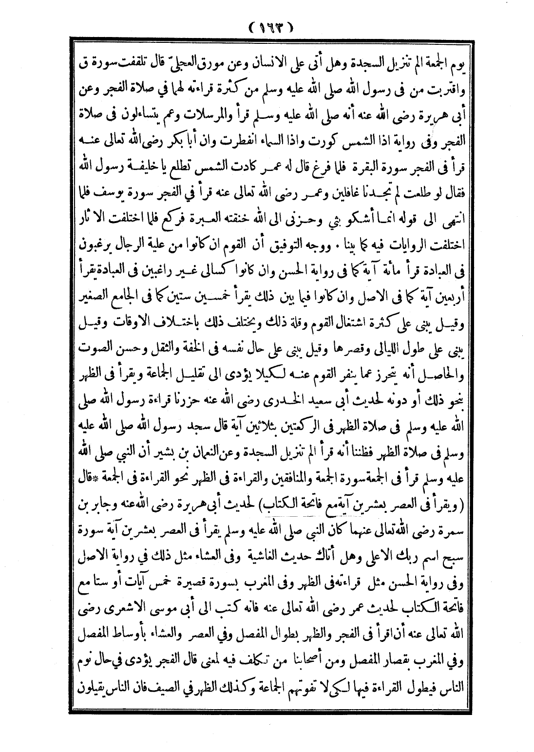 يَوْمَ الْجُمُعَةِ {الم} [السجدة: 1] {تَنْزِيلُ} [السجدة: 2] السَّجْدَةَ وَهَلْ أَتَى عَلَى الْإِنْسَانِ» وَعَنْ «مُوَرِّقٍ الْعِجْلِيِّ قَالَ: تَلَقَّفْتُ سُورَةَ ق وَاقْتَرَبْتُ مِنْ فِي رَسُولِ اللَّهِ - صَلَّى اللَّهُ عَلَيْهِ وَسَلَّمَ - مِنْ كَثْرَةِ قِرَاءَتِهِ لَهُمَا فِي صَلَاةِ الْفَجْرِ» وَعَنْ أَبِي هُرَيْرَةَ - رَضِيَ اللَّهُ عَنْهُ - «أَنَّهُ - صَلَّى اللَّهُ عَلَيْهِ وَسَلَّمَ - قَرَأَ وَالْمُرْسَلَاتِ وَعَمَّ يَتَسَاءَلُونَ فِي صَلَاةِ الْفَجْرِ» وَفِي رِوَايَةٍ إذَا الشَّمْسُ كُوِّرَتْ وَإِذَا السَّمَاءُ انْفَطَرَتْ وَإِنَّ أَبَا بَكْرٍ - رَضِيَ اللَّهُ تَعَالَى عَنْهُ - قَرَأَ فِي الْفَجْرِ سُورَةَ الْبَقَرَةِ فَلَمَّا فَرَغَ قَالَ لَهُ عُمَرُ كَادَتْ الشَّمْسُ تَطْلُعُ يَا خَلِيفَةَ رَسُولِ اللَّهِ فَقَالَ لَوْ طَلَعَتْ لَمْ تَجِدْنَا غَافِلِينَ وَعُمَرُ - رَضِيَ اللَّهُ تَعَالَى عَنْهُ - قَرَأَ فِي الْفَجْرِ سُورَةَ يُوسُفَ فَلَمَّا انْتَهَى إلَى قَوْلِهِ إنَّمَا أَشْكُو بَثِّي وَحُزْنِي إلَى اللَّهِ خَنَقَتْهُ الْعَبْرَةُ فَرَكَعَ فَلَمَّا اخْتَلَفَتْ الْآثَارُ اخْتَلَفَتْ الرِّوَايَاتُ فِيهِ كَمَا بَيَّنَّا وَوَجْهُ التَّوْفِيقِ أَنَّ الْقَوْمَ إنْ كَانُوا مِنْ عِلْيَةِ الرِّجَالِ يَرْغَبُونَ فِي الْعِبَادَةِ قَرَأَ مِائَةَ آيَةٍ كَمَا فِي رِوَايَةِ الْحَسَنِ وَإِنْ كَانُوا كَسَالَى غَيْرَ رَاغِبِينَ فِي الْعِبَادَةِ يَقْرَأُ أَرْبَعِينَ آيَةً كَمَا فِي الْأَصْلِ وَإِنْ كَانُوا فِيمَا بَيْنَ ذَلِكَ يَقْرَأُ خَمْسِينَ سِتِّينَ كَمَا فِي الْجَامِعِ الصَّغِيرِ وَقِيلَ يَبْنِي عَلَى كَثْرَةِ اشْتِغَالِ الْقَوْمِ وَقِلَّةِ ذَلِكَ وَيَخْتَلِفُ ذَلِكَ بِاخْتِلَافِ الْأَوْقَاتِ، وَقِيلَ يَبْنِي عَلَى طُولِ اللَّيَالِي وَقِصَرِهَا، وَقِيلَ يَبْنِي عَلَى حَالِ نَفْسِهِ فِي الْخِفَّةِ وَالثِّقَلِ وَحُسْنِ الصَّوْتِ، وَالْحَاصِلُ أَنَّهُ يَتَحَرَّزُ عَمَّا يُنَفِّرُ الْقَوْمَ عَنْهُ لِكَيْ لَا يُؤَدِّيَ إلَى تَقْلِيلِ الْجَمَاعَةِ وَيَقْرَأُ فِي الظُّهْرِ بِنَحْوِ ذَلِكَ أَوْ دُونَهُ لِحَدِيثِ «أَبِي سَعِيدٍ الْخُدْرِيِّ - رَضِيَ اللَّهُ عَنْهُ - حَزَرْنَا قِرَاءَةَ رَسُولِ اللَّهِ - صَلَّى اللَّهُ عَلَيْهِ وَسَلَّمَ - فِي صَلَاةِ الظُّهْرِ فِي الرَّكْعَتَيْنِ بِثَلَاثِينَ آيَةً قَالَ سَجَدَ رَسُولُ اللَّهِ - صَلَّى اللَّهُ عَلَيْهِ وَسَلَّمَ - فِي صَلَاةِ الظُّهْرِ فَظَنَنَّا أَنَّهُ قَرَأَ الم تَنْزِيلُ السَّجْدَةَ»، وَعَنْ النُّعْمَانِ بْنِ بَشِيرٍ «أَنَّ النَّبِيَّ - صَلَّى اللَّهُ عَلَيْهِ وَسَلَّمَ - قَرَأَ فِي الْجُمُعَةِ سُورَةَ الْجُمُعَةِ وَالْمُنَافِقِينَ، وَالْقِرَاءَةُ فِي الظُّهْرِ نَحْوُ الْقِرَاءَةِ فِي الْجُمُعَةِ»