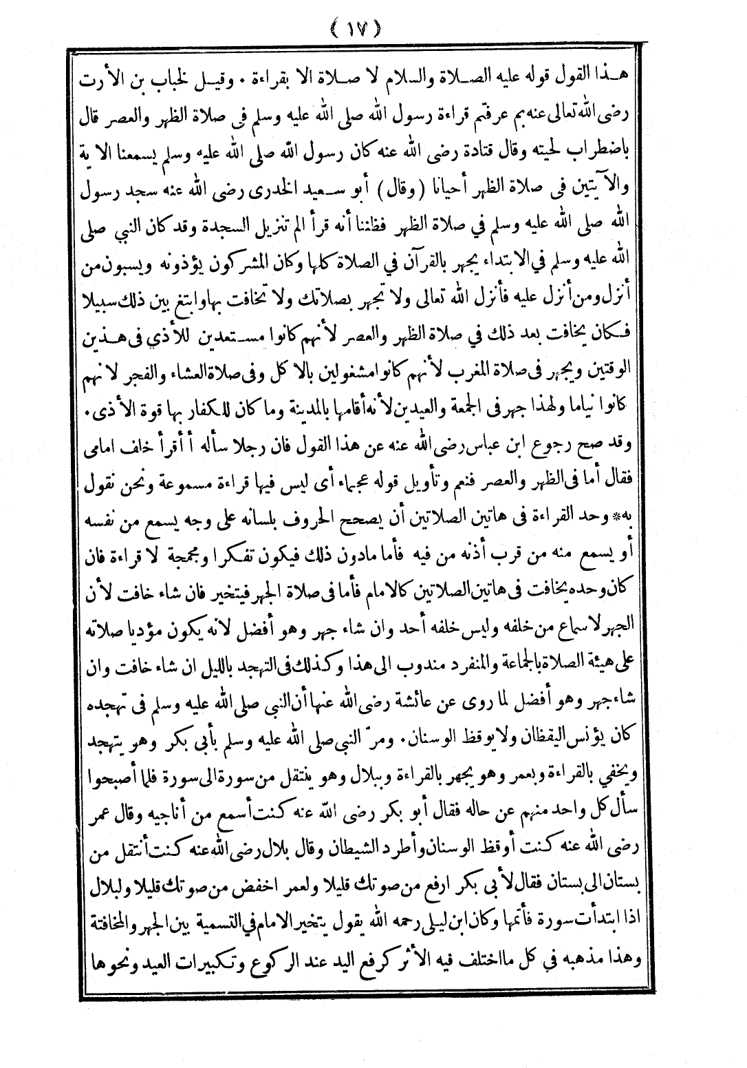 هَذَا الْقَوْلِ قَوْلُهُ - عَلَيْهِ الصَّلَاةُ وَالسَّلَامُ -: «لَا صَلَاةَ إلَّا بِقِرَاءَةٍ»، وَقِيلَ لِخَبَّابِ بْنِ الْأَرَتِّ - رَضِيَ اللَّهُ تَعَالَى عَنْهُ -: «بِمَ عَرَفْتُمْ قِرَاءَةَ رَسُولِ اللَّهِ - صَلَّى اللَّهُ عَلَيْهِ وَسَلَّمَ - فِي صَلَاةِ الظُّهْرِ وَالْعَصْرِ؟ قَالَ: بِاضْطِرَابِ لِحْيَتِهِ»، وَقَالَ قَتَادَةُ - رَضِيَ اللَّهُ عَنْهُ -: «كَانَ رَسُولُ اللَّهِ - صَلَّى اللَّهُ عَلَيْهِ وَسَلَّمَ - يُسْمِعُنَا الْآيَةَ وَالْآيَتَيْنِ فِي صَلَاةِ الظُّهْرِ أَحْيَانًا».