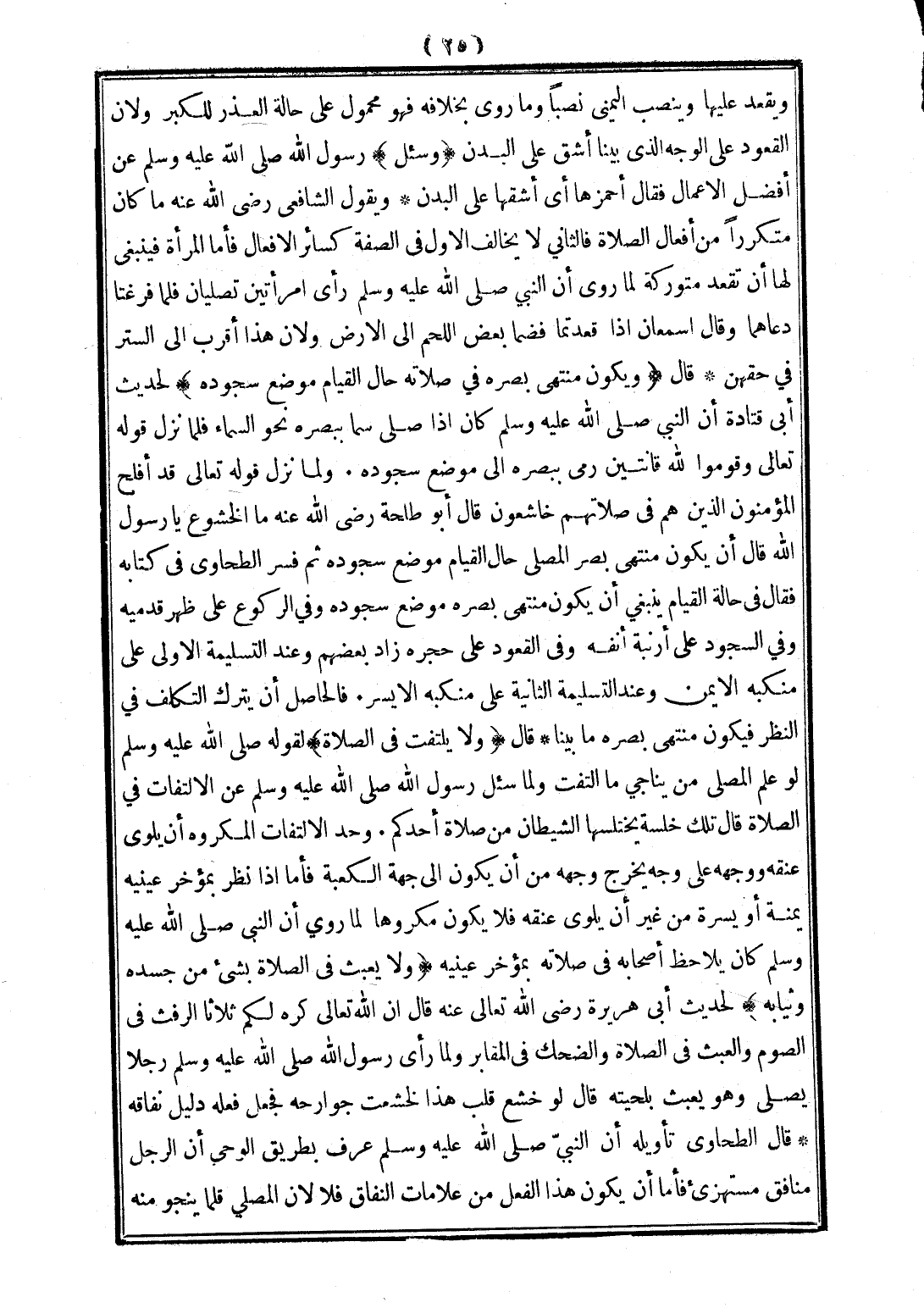 قَالَ (وَيَكُونُ مُنْتَهَى بَصَرِهِ فِي صَلَاتِهِ حَالَ الْقِيَامِ مَوْضِعَ سُجُودِهِ) لِحَدِيثِ أَبِي قَتَادَةَ: «أَنَّ النَّبِيَّ - صَلَّى اللَّهُ عَلَيْهِ وَسَلَّمَ - كَانَ إذَا صَلَّى سَمَا بِبَصَرِهِ نَحْوَ السَّمَاءِ فَلَمَّا نَزَلَ قَوْله تَعَالَى: {وَقُومُوا لِلَّهِ قَانِتِينَ} [البقرة: 238] رَمَى بِبَصَرِهِ إلَى مَوْضِعِ سُجُودِهِ»، وَلَمَّا نَزَلَ قَوْله تَعَالَى: {قَدْ أَفْلَحَ الْمُؤْمِنُونَ} [المؤمنون: 1] {الَّذِينَ هُمْ فِي صَلاتِهِمْ خَاشِعُونَ} [المؤمنون: 2] قَالَ أَبُو طَلْحَةَ - رَضِيَ اللَّهُ عَنْهُ - مَا الْخُشُوعُ يَا رَسُولَ اللَّهِ قَالَ: «أَنْ يَكُونَ مُنْتَهَى بَصَرِ الْمُصَلِّي حَالَ الْقِيَامِ مَوْضِعَ سُجُودِهِ»، ثُمَّ فَسَّرَ الطَّحَاوِيُّ فِي كِتَابِهِ فَقَالَ فِي حَالَةِ الْقِيَامِ يَنْبَغِي أَنْ يَكُونَ مُنْتَهَى بَصَرِهِ مَوْضِعَ سُجُودِهِ، وَفِي الرُّكُوعِ عَلَى ظَهْرِ قَدَمَيْهِ، وَفِي السُّجُودِ عَلَى أَرْنَبَةِ أَنْفِهِ، وَفِي الْقُعُودِ عَلَى حِجْرِهِ زَادَ بَعْضُهُمْ وَعِنْدَ التَّسْلِيمَةِ الْأُولَى عَلَى مَنْكِبِهِ الْأَيْمَنِ وَعِنْدَ التَّسْلِيمَةِ الثَّانِيَةِ عَلَى مَنْكِبِهِ الْأَيْسَرِ، فَالْحَاصِلُ أَنْ يَتْرُكَ التَّكَلُّفَ فِي النَّظَرِ فَيَكُونُ مُنْتَهَى بَصَرِهِ مَا بَيَّنَّا.