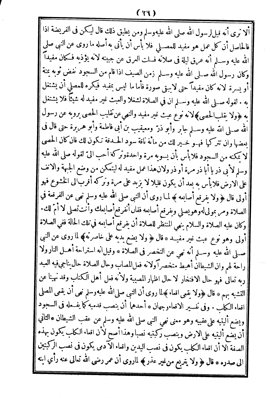 أَلَا تَرَى أَنَّهُ «قِيلَ لِرَسُولِ اللَّهِ - صَلَّى اللَّهُ عَلَيْهِ وَسَلَّمَ -: وَمَنْ يُطِيقُ ذَلِكَ؟ قَالَ لِيَكُنْ فِي الْفَرِيضَةِ»، إذًا فَالْحَاصِلُ أَنَّ كُلَّ عَمَلٍ هُوَ مُفِيدٌ لِلْمُصَلِّي، فَلَا بَأْسَ أَنْ يَأْتِيَ بِهِ أَصْلُهُ مَا رُوِيَ عَنْ النَّبِيِّ - صَلَّى اللَّهُ عَلَيْهِ وَسَلَّمَ -: «أَنَّهُ عَرِقَ لَيْلَةً فِي صَلَاتِهِ فَسَلَتَ الْعَرَقَ عَنْ جَبِينِهِ»؛ لِأَنَّهُ يُؤْذِيهِ فَكَانَ مُفِيدًا: «وَكَانَ رَسُولُ اللَّهِ - صَلَّى اللَّهُ عَلَيْهِ وَسَلَّمَ - زَمَنَ الصَّيْفِ إذَا قَامَ مِنْ السُّجُودِ نَفَضَ ثَوْبَهُ يَمْنَةً أَوْ يَسْرَةً»؛ لِأَنَّهُ كَانَ مُفِيدًا حَتَّى لَا يُبْقِي صُورَةً، فَأَمَّا مَا لَيْسَ بِمُفِيدٍ فَيُكْرَهُ لِلْمُصَلِّي أَنْ يَشْتَغِلَ بِهِ، لِقَوْلِهِ - صَلَّى اللَّهُ عَلَيْهِ وَسَلَّمَ -: «إنَّ فِي الصَّلَاةِ لَشُغْلًا»، وَالْعَبَثُ غَيْرُ مُفِيدٍ لَهُ شَيْئًا، فَلَا يَشْتَغِلُ بِهِ.