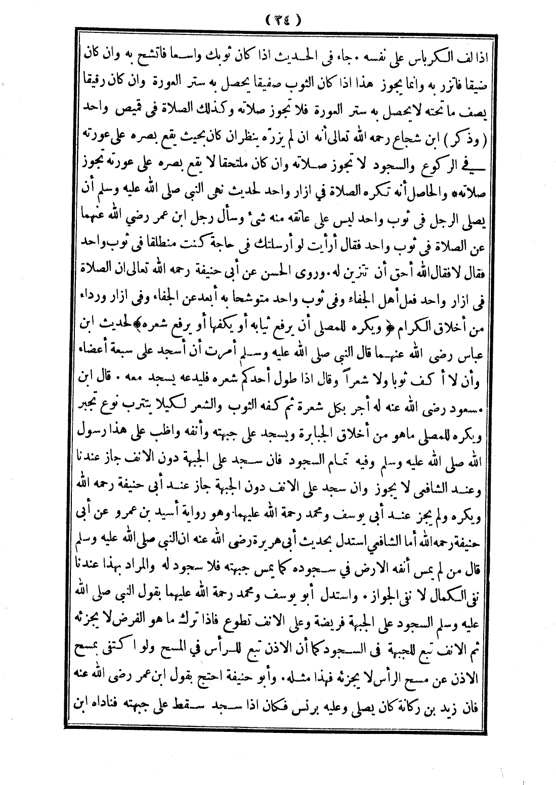 إذَا لَفَّ الْكِرْبَاسَ عَلَى نَفْسِهِ، جَاءَ فِي الْحَدِيثِ: «إذَا كَانَ ثَوْبُكَ وَاسِعًا فَاتَّشِحْ بِهِ، وَإِنْ كَانَ ضَيِّقًا فَاِتَّزِرْ بِهِ»، وَإِنَّمَا يَجُوزُ هَذَا إذَا كَانَ الثَّوْبُ صَفِيقًا يَحْصُلُ بِهِ سَتْرُ الْعَوْرَةِ، وَإِنْ كَانَ رَقِيقًا يَصِفُ مَا تَحْتَهُ لَا يَحْصُلُ بِهِ سَتْرُ الْعَوْرَةِ، فَلَا تَجُوزُ صَلَاتُهُ وَكَذَلِكَ الصَّلَاةُ فِي قَمِيصٍ وَاحِدٍ.