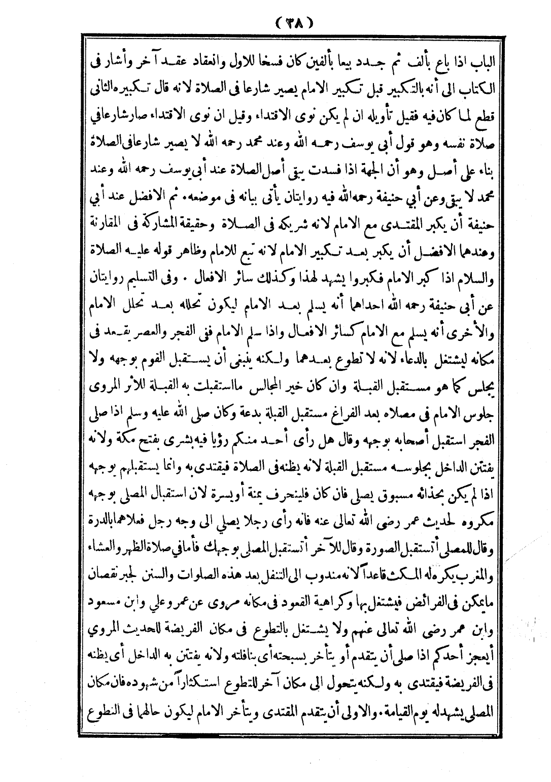 الْبَابِ إذَا بَاعَ بِأَلْفٍ ثُمَّ جَدَّدَ بَيْعًا بِأَلْفَيْنِ كَانَ فَسْخًا لِلْأَوَّلِ وَانْعِقَادَ عَقْدٍ آخَرَ وَأَشَارَ فِي الْكِتَابِ إلَى أَنَّهُ قَبْلَ تَكْبِيرِ الْإِمَامِ يَصِيرُ شَارِعًا فِي الصَّلَاةِ؛ لِأَنَّهُ قَالَ تَكْبِيرَةُ الثَّانِي قَطْعٌ لِمَا كَانَ فِيهِ فَقِيلَ تَأْوِيلُهُ إنْ لَمْ يَكُنْ نَوَى الِاقْتِدَاءَ وَقِيلَ إنْ نَوَى الِاقْتِدَاءَ صَارَ شَارِعًا فِي صَلَاةِ نَفْسِهِ.