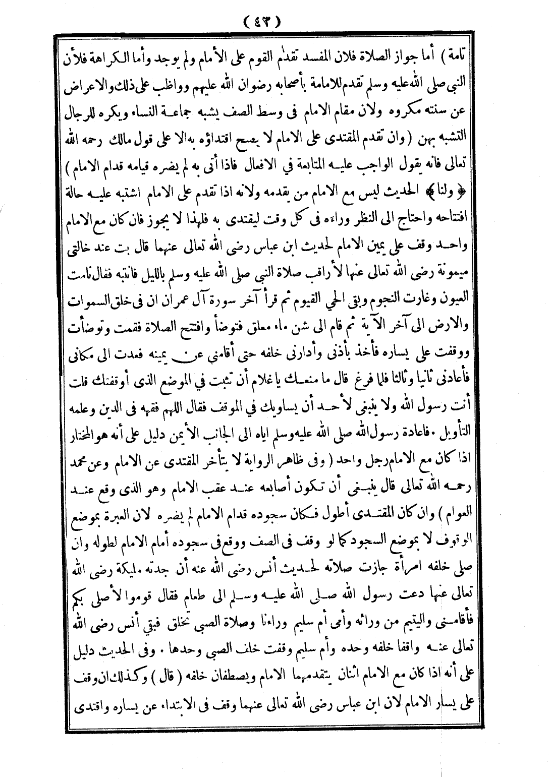 فَإِنْ كَانَ مَعَ الْإِمَامِ وَاحِدٌ وَقَفَ عَلَى يَمِينِ الْإِمَامِ لِحَدِيثِ ابْنِ عَبَّاسٍ - رَضِيَ اللَّهُ تَعَالَى عَنْهُمَا - قَالَ بِتُّ عِنْدَ خَالَتِي مَيْمُونَةَ - رَضِيَ اللَّهُ تَعَالَى عَنْهَا - لِأُرَاقِبَ صَلَاةَ النَّبِيِّ - صَلَّى اللَّهُ عَلَيْهِ وَسَلَّمَ - بِاللَّيْلِ فَانْتَبَهَ فَقَالَ: «نَامَتْ الْعُيُونُ وَغَارَتْ النُّجُومُ وَبَقِيَ الْحَيُّ الْقَيُّومُ، ثُمَّ قَرَأَ آخِرَ سُورَةِ آلِ عُمْرَانِ: {إنَّ فِي خَلْقِ السَّمَاوَاتِ وَالْأَرْضِ} [البقرة: 164] إلَى آخِرِ الْآيَةِ، ثُمَّ قَامَ إلَى شَنِّ مَاءٍ مُعَلَّقٍ فَتَوَضَّأَ وَافْتَتَحَ الصَّلَاةَ فَقُمْتُ وَتَوَضَّأْتُ وَوَقَفْتُ عَلَى يَسَارِهِ فَأَخَذَ بِأُذُنِي وَأَدَارَنِي خَلْفَهُ حَتَّى أَقَامَنِي عَنْ يَمِينِهِ فَعُدْتُ إلَى مَكَانِي فَأَعَادَنِي ثَانِيًا وَثَالِثًا فَلَمَّا فَرَغَ قَالَ مَا مَنَعَكَ يَا غُلَامُ أَنْ تَثْبُتَ فِي الْمَوْضِعِ الَّذِي أَوْقَفْتُكَ قُلْتُ: أَنْتَ رَسُولُ اللَّهِ وَلَا يَنْبَغِي لِأَحَدٍ أَنْ يُسَاوِيَكَ فِي الْمَوْقِفِ فَقَالَ اللَّهُمَّ فَقِّهْهُ فِي الدِّينِ وَعَلِّمْهُ التَّأْوِيلَ»، فَإِعَادَة رَسُولِ اللَّهِ - صَلَّى اللَّهُ عَلَيْهِ وَسَلَّمَ - إيَّاهُ إلَى الْجَانِبِ الْأَيْمَنِ دَلِيلٌ عَلَى أَنَّهُ هُوَ الْمُخْتَارُ إذَا كَانَ مَعَ الْإِمَامِ رَجُلٌ وَاحِدٌ. (وَفِي ظَاهِرِ الرِّوَايَةِ لَا يَتَأَخَّرُ الْمُقْتَدِي عَنْ الْإِمَامِ وَعَنْ مُحَمَّدٍ - رَحِمَهُ اللَّهُ تَعَالَى - قَالَ يَنْبَغِي أَنْ تَكُونَ أَصَابِعُهُ عِنْدَ عَقِبِ الْإِمَامِ، وَهُوَ الَّذِي وَقَعَ عِنْدَ الْعَوَامّ).