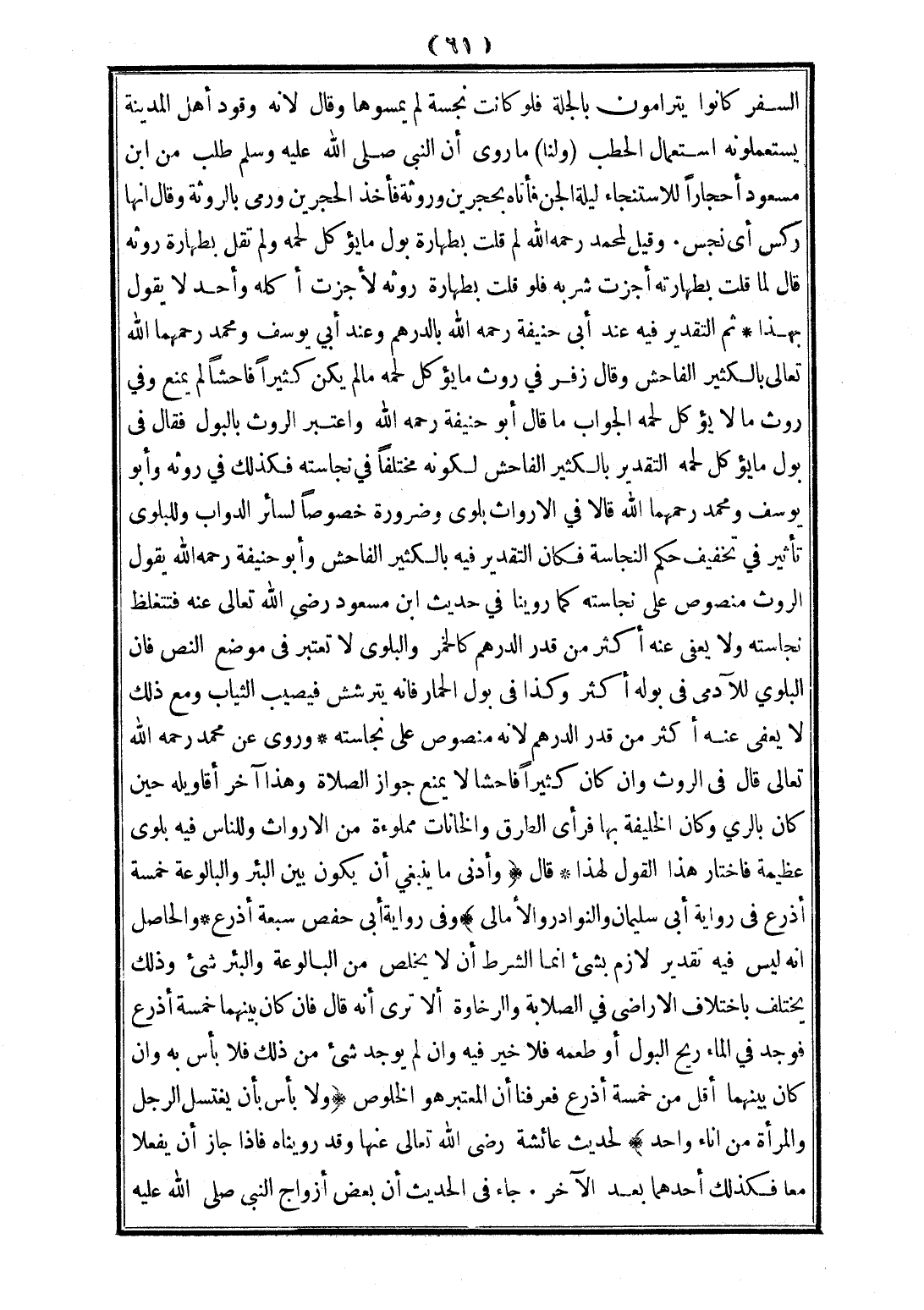 وَقِيلَ لِمُحَمَّدٍ - رَحِمَهُ اللَّهُ - لِمَ قُلْت بِطَهَارَةِ بَوْلِ مَا يُؤْكَلُ لَحْمُهُ، وَلَمْ تَقُلْ بِطَهَارَةِ رَوْثِهِ قَالَ: لَمَّا قُلْت بِطَهَارَتِهِ أَجَزْت شُرْبَهُ فَلَوْ قُلْت بِطَهَارَةِ رَوْثِهِ لَأَجَزْت أَكْلَهُ، وَأَحَدٌ لَا يَقُولُ بِهَذَا، ثُمَّ التَّقْدِيرُ فِيهِ عِنْدَ أَبِي حَنِيفَةَ - رَحِمَهُ اللَّهُ - بِالدِّرْهَمِ، وَعِنْدَ أَبِي يُوسُفَ وَمُحَمَّدٍ - رَحِمَهُمَا اللَّهُ تَعَالَى - بِالْكَثِيرِ الْفَاحِشِ، وَقَالَ زُفَرُ فِي رَوْثِ مَا يُؤْكَلُ لَحْمُهُ مَا لَمْ يَكُنْ كَثِيرًا فَاحِشًا لَمْ يَمْنَعْ، وَفِي رَوْثِ مَا لَا يُؤْكَلُ لَحْمُهُ الْجَوَابُ مَا قَالَ أَبُو حَنِيفَةَ - رَحِمَهُ اللَّهُ -، وَاعْتَبَرَ الرَّوْثَ بِالْبَوْلِ فَقَالَ فِي بَوْلِ مَا يُؤْكَلُ لَحْمُهُ التَّقْدِيرُ بِالْكَثِيرِ الْفَاحِشِ لِكَوْنِهِ مُخْتَلَفًا فِي نَجَاسَتِهِ فَكَذَلِكَ فِي رَوْثِهِ وَأَبُو يُوسُفَ وَمُحَمَّدٌ رَحِمَهُمَا اللَّهُ قَالَا فِي الْأَرْوَاثِ بَلْوًى، وَضَرُورَةٌ خُصُوصًا لِسَائِرِ الدَّوَابِّ، وَلِلْبَلْوَى تَأْثِيرٌ فِي تَخْفِيفِ حُكْمِ النَّجَاسَةِ فَكَانَ التَّقْدِيرُ فِيهِ بِالْكَثِيرِ الْفَاحِشِ وَأَبُو حَنِيفَةَ - رَحِمَهُ اللَّهُ - يَقُولُ: الرَّوْثُ مَنْصُوصٌ عَلَى نَجَاسَتِهِ كَمَا رَوَيْنَا فِي حَدِيثِ ابْنِ مَسْعُودٍ - رَضِيَ اللَّهُ تَعَالَى عَنْهُ - فَتَتَغَلَّظُ نَجَاسَتُهُ، وَلَا يُعْفَى عَنْهُ أَكْثَرُ مِنْ قَدْرِ الدِّرْهَمِ كَالْخَمْرِ، وَالْبَلْوَى لَا تُعْتَبَرُ فِي مَوْضِعِ النَّصِّ فَإِنَّ الْبَلْوَى لِلْآدَمِيِّ فِي بَوْلِهِ أَكْثَرُ، وَكَذَا فِي بَوْلِ الْحِمَارِ فَإِنَّهُ يَتَرَشَّشُ فَيُصِيبُ الثِّيَابَ، وَمَعَ ذَلِكَ لَا يُعْفَى عَنْهُ مِنْ قَدْرِ الدِّرْهَمِ لِأَنَّهُ مَنْصُوصٌ عَلَى نَجَاسَتِهِ، وَرُوِيَ عَنْ مُحَمَّدٍ - رَحِمَهُ اللَّهُ تَعَالَى - قَالَ فِي الرَّوْثِ، وَإِنْ كَانَ فَاحِشًا لَا يَمْنَعُ جَوَازَ الصَّلَاةِ، وَهَذَا آخِرُ أَقَاوِيلِهِ حِينَ كَانَ بِالرَّيِّ، وَكَانَ الْخَلِيفَةُ بِهَا فَرَأَى الطُّرُقَ، وَالْخَانَاتِ مَمْلُوءَةً مِنْ الْأَرْوَاثِ، وَلِلنَّاسِ فِيهِ بَلْوًى عَظِيمَةً فَاخْتَارَ هَذَا الْقَوْلَ لِهَذَا.
