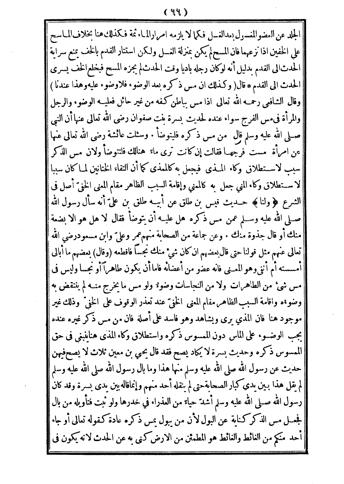 وَعَنْ جَمَاعَةٍ مِنْ الصَّحَابَةِ مِنْهُمْ عُمَرُ وَعَلِيٌّ وَابْنُ مَسْعُودٍ - رَضِيَ اللَّهُ تَعَالَى عَنْهُمْ - مِثْلُ قَوْلِنَا حَتَّى قَالَ بَعْضُهُمْ إنْ كَانَ شَيْءٌ مِنْكَ نَجِسًا فَاقْطَعْهُ (وَقَالَ) بَعْضُهُمْ مَا أُبَالِي أَمَسِسْته أَمْ أَنْفِي، وَهُوَ الْمَعْنَى فَإِنَّهُ عُضْوٌ مِنْ أَعْضَائِهِ فَإِمَّا أَنْ يَكُونَ طَاهِرًا، أَوْ نَجِسًا، وَلَيْسَ فِي مَسِّ شَيْءٍ مِنْ الطَّاهِرَاتِ، وَلَا مِنْ النَّجَاسَاتِ وُضُوءٌ، وَلَوْ مَسَّ مَا يَخْرُجُ مِنْهُ لَمْ يُنْتَقَضْ بِهِ وُضُوءُهُ، وَإِقَامَةُ السَّبَبِ الظَّاهِرِ مَقَامَ الْمَعْنَى الْخَفِيُّ عِنْدَ تَعَذُّرِ الْوُقُوفِ عَلَى الْخَفِيِّ، وَذَلِكَ غَيْرُ مَوْجُودٍ هُنَا فَإِنَّ الْمَذْيَ يُرَى، وَيُشَاهَدُ، وَهُوَ فَاسِدٌ عَلَى أَصْلِهِ فَإِنَّ مَنْ مَسَّ ذَكَرَهُ غَيْرُهُ عِنْدَهُ يَجِبُ الْوُضُوءُ عَلَى الْمَاسِّ دُونَ الْمَمْسُوسِ ذَكَرَهُ، وَاسْتِطْلَاقُ وِكَاءِ الْمَذْي هُنَا يَنْبَغِي فِي حَقِّ الْمَمْسُوسِ ذَكَرُهُ، وَحَدِيثُ بُسْرَةَ لَا يَكَادُ يَصِحُّ فَقَدْ قَالَ يَحْيَى بْنُ مَعِينٍ ثَلَاثٌ لَا يَصِحُّ فِيهِنَّ حَدِيثٌ عَنْ رَسُولِ اللَّهِ - صَلَّى اللَّهُ عَلَيْهِ وَسَلَّمَ - مِنْهَا هَذَا، وَمَا بَالُ رَسُولِ اللَّهِ - صَلَّى اللَّهُ عَلَيْهِ وَسَلَّمَ - لَمْ يَقُلْ هَذَا بَيْنَ يَدَيْ كِبَارِ الصَّحَابَةِ حَتَّى لَمْ يَنْقُلْهُ أَحَدٌ مِنْهُمْ، وَإِنَّمَا قَالَهُ بَيْنَ يَدَيْ بُسْرَةَ، وَقَدْ كَانَ رَسُولُ اللَّهِ - صَلَّى اللَّهُ عَلَيْهِ وَسَلَّمَ - أَشَدُّ حَيَاءً مِنْ الْعَذْرَاءِ فِي خِدْرِهَا، وَلَوْ ثَبَتَ فَتَأْوِيلُهُ: مَنْ بَالَ، فَجَعَلَ مَسَّ الذَّكَرِ عَنْ الْبَوْلِ؛ لِأَنَّ مَنْ يَبُولُ يَمَسُّ ذَكَرَهُ عَادَةً كَقَوْلِهِ تَعَالَى {، أَوْ جَاءَ أَحَدٌ مِنْكُمْ مِنْ الْغَائِطِ} [النساء: 43]، وَالْغَائِطُ هُوَ الْمُطْمَئِنُّ مِنْ الْأَرْضِ كَنَّى بِهِ عَنْ الْحَدَثِ؛ لِأَنَّهُ يَكُونُ فِي