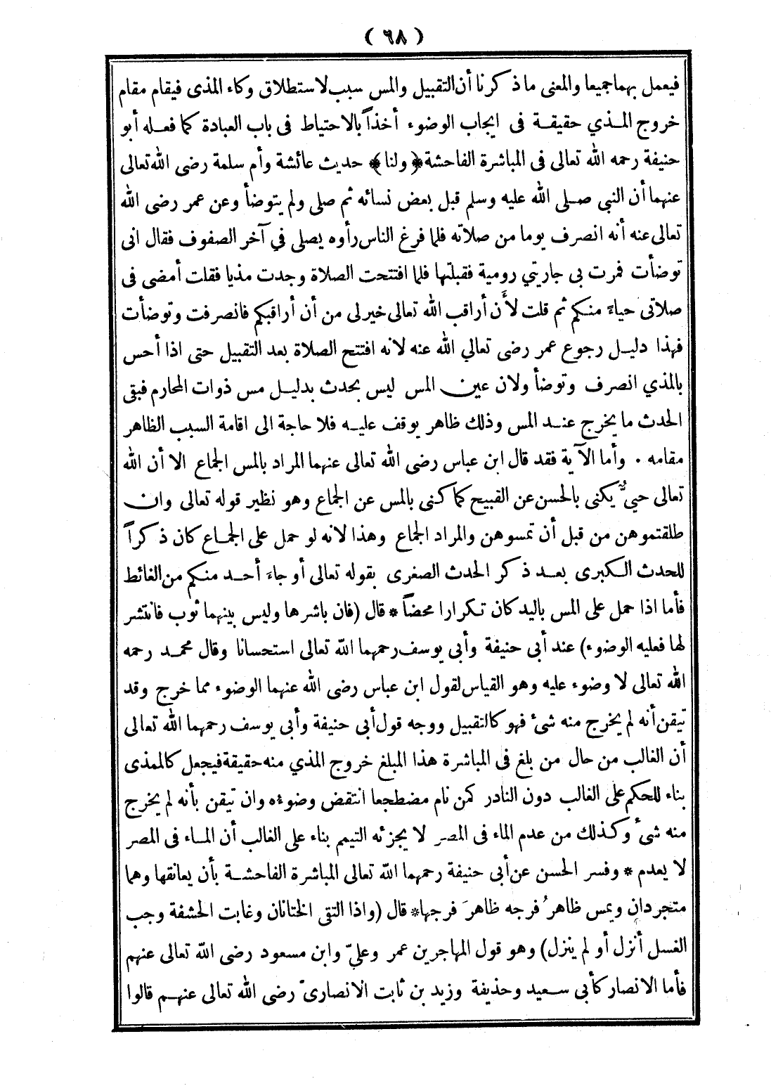 قَالَ (فَإِنْ بَاشَرَهَا، وَلَيْسَ بَيْنَهُمَا ثَوْبٌ فَانْتَشَرَ لَهَا فَعَلَيْهِ الْوُضُوءُ) عِنْدَ أَبِي حَنِيفَةَ وَأَبِي يُوسُفَ - رَحِمَهُمَا اللَّهُ تَعَالَى - اسْتِحْسَانًا، وَقَالَ مُحَمَّدٌ - رَحِمَهُ اللَّهُ تَعَالَى - لَا وُضُوءَ عَلَيْهِ، وَهُوَ الْقِيَاسُ لِقَوْلِ ابْنِ عَبَّاسٍ - رَضِيَ اللَّهُ عَنْهُمَا - الْوُضُوءُ مِمَّا خَرَجَ، وَقَدْ تَيَقَّنَ أَنَّهُ لَمْ يَخْرُجْ مِنْهُ شَيْءٌ فَهُوَ كَالتَّقْبِيلِ، وَوَجْهُ قَوْلِ أَبِي حَنِيفَةَ وَأَبِي يُوسُفَ - رَحِمَهُمَا اللَّهُ تَعَالَى - أَنَّ الْغَالِبَ مِنْ حَالِ مَنْ بَلَغَ فِي الْمُبَاشَرَةِ هَذَا الْمَبْلَغَ خُرُوجُ الْمَذْيِ مِنْهُ حَقِيقَةً فَيُجْعَلُ كَالْمُمْذِي بِنَاءً لِلْحُكْمِ عَلَى الْغَالِبِ دُونَ النَّادِرِ كَمَنْ نَامَ مُضْطَجِعًا انْتَقَضَ وُضُوءُهُ، وَإِنْ تَيَقَّنَ بِأَنَّهُ لَمْ يَخْرُجْ مِنْهُ شَيْءٌ، وَكَذَلِكَ مَنْ عَدِمَ الْمَاءَ فِي الْمِصْرِ لَا يُجْزِئُهُ التَّيَمُّمَ بِنَاءً عَلَى الْغَالِبِ أَنَّ الْمَاءَ فِي الْمِصْرِ لَا يَعْدَمُ، وَفَسَّرَ الْحَسَنُ عَنْ أَبِي حَنِيفَةَ - رَحِمَهُمَا اللَّهُ تَعَالَى - الْمُبَاشَرَةَ الْفَاحِشَةَ بِأَنْ يُعَانِقَهَا، وَهُمَا مُتَجَرِّدَانِ، وَيَمَسَّ ظَاهِرُ فَرْجِهِ ظَاهِرَ فَرْجِهَا.
