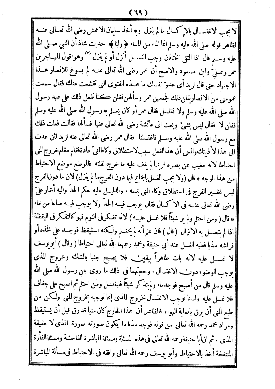 ، وَخُرُوجُ الْمَذْيِ يُوجِبُ الْوُضُوءَ دُونَ الِاغْتِسَالِ.، وَحُجَّتُهُمَا فِي ذَلِكَ مَا رُوِيَ عَنْ رَسُولِ اللَّهِ - صَلَّى اللَّهُ عَلَيْهِ وَسَلَّمَ - قَالَ «مَنْ أَصْبَحَ فَوَجَدَ مَاءً، وَلَمْ يَتَذَكَّرْ شَيْئًا فَلْيَغْتَسِلْ، وَمَنْ احْتَلَمَ، ثُمَّ أَصْبَحَ عَلَى جَفَافٍ فَلَا غُسْلَ عَلَيْهِ»، وَلَسْنَا نُوجِبُ الِاغْتِسَالَ بِخُرُوجِ الْمَذْيِ إنَّمَا نُوجِبُهُ بِخُرُوجِ الْمَنِيِّ، وَلَكِنْ مِنْ طَبْعِ الْمَنِيِّ أَنْ يَرِقَّ بِإِصَابَةِ الْهَوَاءِ فَالظَّاهِرُ أَنَّ هَذَا الْخَارِجَ كَانَ مَنِيًّا قَدْ رَقَّ قَبْلَ أَنْ يَسْتَيْقِظَ، وَمُرَادُ مُحَمَّدٍ - رَحِمَهُ اللَّهُ تَعَالَى - مِنْ قَوْلِهِ فَوَجَدَ مَذْيًا مَا يَكُونُ صُورَتُهُ صُورَةَ الْمَذْيِ لَا حَقِيقَةَ الْمَذْيِ.